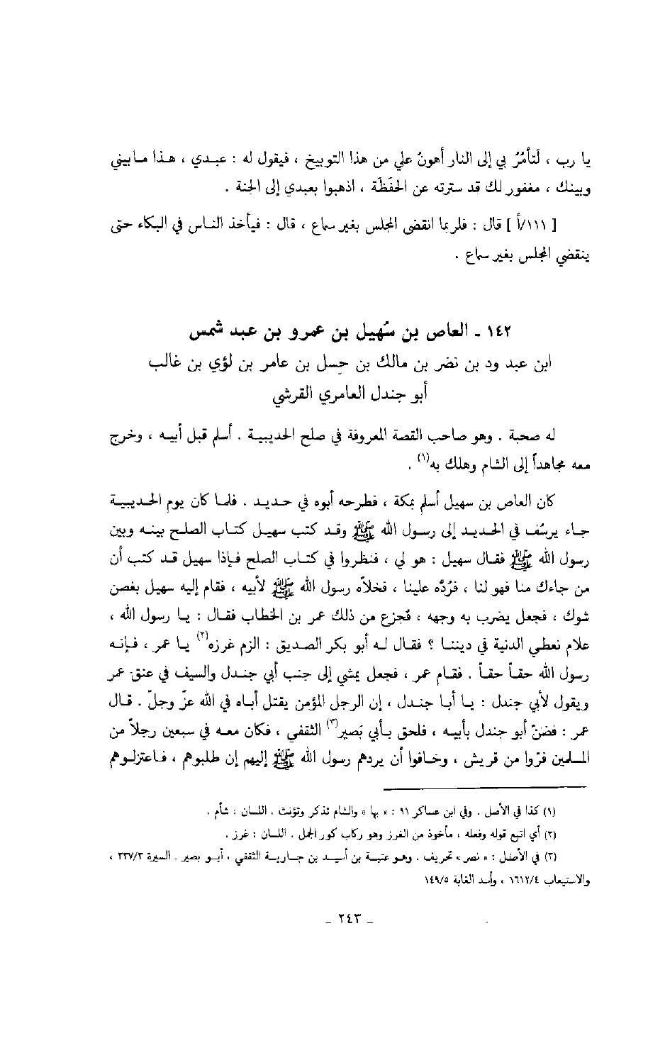 كان العاص بن سهيل أسلم بمكة، فطرحه أبوه في حديد. فلما كان يوم الحديبية جاء يرسُف في الحديد إلى رسول الله صَلَّى اللهُ عَلَيْهِ وَسَلَّمَ وقد كتب سهيل كتاب الصلح بينه وبين رسول الله صَلَّى اللهُ عَلَيْهِ وَسَلَّمَ فقال سهيل: هو لي، فنظروا في كتاب الصلح فإذا سهيل قد كتب أن من جاءك منا فهو لنا، فرُدَّه علينا، فخلاّه رسول الله صَلَّى اللهُ عَلَيْهِ وَسَلَّمَ لأبيه، فقام إليه سهيل بغصن شوك، فجعل يضرب به وجهه، فجزع من ذلك عمر بن الخطاب فقال: يا رسول الله، علام نعطي الدنية في ديننا:؟ فقال له أبو بكر الصديق: الزم غرزه يا عمر، فإنه رسول الله حقاً حقاً. فقام عمر، فجعل يمشي إلى جنب أبي جندل والسيف في عنق عمر ويقول لأبي جندل: يا أبا جندل، إن الرجل المؤمن يقتل أباه في الله عزّ وجلّ. قال عمر: فضنّ أبو جندل بأبيه، فلحق بأبي بَصير الثقفي، فكان معه في سبعين رجلاً من المسلمين فرّوا من قريش، وخافوا أن يردهم رسول الله صَلَّى اللهُ عَلَيْهِ وَسَلَّمَ إليهم إن طلبوهم، فاعتزلوهم