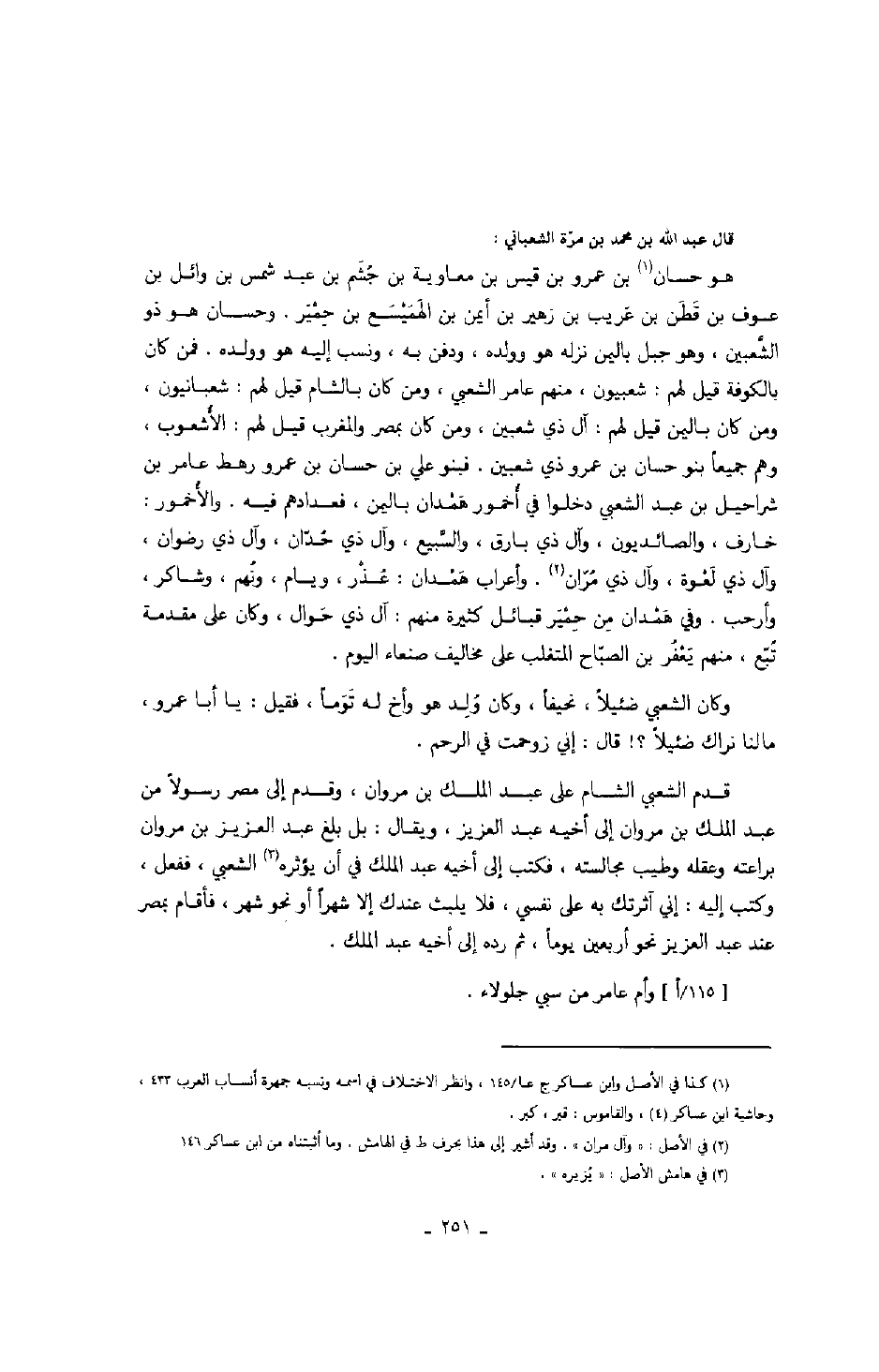 قال عبد الله بن محمد بن مرّة الشعباني: هو حسان بن عمرو بن قيس بن معاوية بن حُشّم بن عبد شمس بن وائل بن عوف بن قَطَن بن عَريب بن زهير بن أيمن بن الهَمَيْسَع بن حِمْيَر. وحسان هو ذو الشَّعبين، وهو جبل باليمن نزله هو وولده، ودفن به، ونسب إليه هو وولده. فمن كان بالكوفة قيل لهم: شعبيون، منهم عامر الشعبي، ومن كان بالشام قيل لهم: شعبانيون، ومن كان باليمن قيل لهم: آل ذي شعبين، ومن كان بمصر والمغرب قيل لهم: الأشعوب، وهم جميعاً بنو حسان بن عمرو ذي شعبين. فبنو علي بن حسان بن عمرو رهط عامر بن شراحيل بن عبد الشعبي دخلوا في أُخمور هَمْدان باليمن، فعدادهم فيه. والأُخمور: خارف، والصائديون، وآل ذي بارق والسَّبيع، وآل ذي حُدّان، وآل ذي رضوان، وآل ذي لَعْوة، وآل ذي مُرَان. وأعراب هَمْدان: عُذْر، ويام، ونُهم، وشاكر، وأرحب. وفي هَمْدان مِن حِمْيَر قبائل كثيرة منهم: آل ذي حَوال، وكان على مقدمة تُبّع، منهم يَعْفُر بن الصّباح المتغلب على مخاليف صنعاء اليوم.