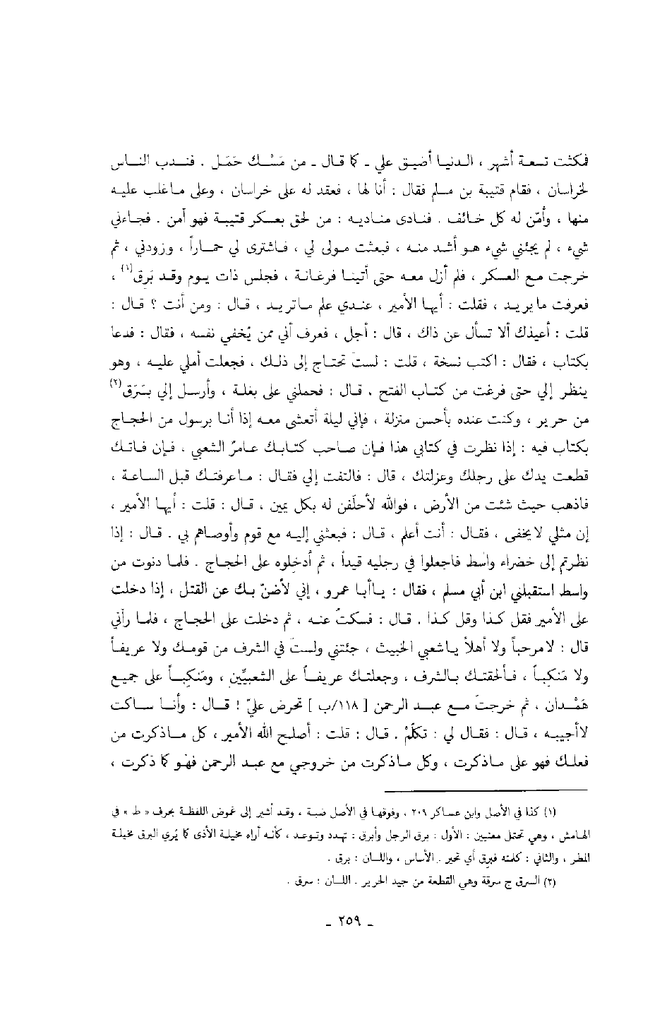 فمكثت تسعة أشهر، الدنيا أضيق علي كما قال من مَسْك حَمَل. فندب الناس لخراسان، فقام قتيبة بن مسلم فقال: أنا لها، فعقد له على خراسان، وعلى ما غلب عليه منها، وأمّن له كل خائف. فنادى مناديه: من لحق بعسكر قتيبة فهو آمن. فجاءني شيء، لم يجئني شيء هو أشد منه، فبعثت مولى لي، فاشترى لي حماراً، وزودني، ثم خرجت مع العسكر، فلم أزل معه حتى أتينا فرغانة، فجلس ذات يوم وقد بَرِق، فعرفت ما يريد، فقلت: أيها الأمير، عندي علم ما تريد، قال: ومن أنت؟ قال: قلت: أعيذك ألا تسأل عن ذاك، قال: أجل، فعرف أني ممن يُخفي نفسه، فقال: فدعا بكتاب، فقال: اكتب نسخة، قلت: لستّ تحتاج إلى ذلك، فجعلت أملي عليه، وهو ينظر إلي حتى فرغت من كتاب الفتح، قال: فحملني على بغلة، وأرسل إلي بسَرَق من حرير، وكنت عنده بأحسن منزلة، فإني ليلة أتعشى معه إذا أنا برسول من الحجاج بكتاب فيه: إذا نظرت في كتابي هذا فإن صاحب كتابك عامرٌ الشعبي، فإن فاتك قطعت يدك على رجلك وعزلتك، قال: فالتفت إلي فقال: ما عرفتك قبل الساعة، فاذهب حيث شئت من الأرض، فوالله لأحلَفن له بكل يمين، قال: قلت: أيها الأمير، إن مثلي لا يخفى، فقال: أنت أعلم، قال: فبعثني إليه مع قوم وأوصاهم بي. قال: إذا نظرتم إلى خضراء واسط فاجعلوا في رجليه قيداً، ثم أدخِلوه على الحجاج. فلما دنوت من واسط استقبلني ابن أبي مسلم، فقال: يا أبا عمرو، إني لأضنّ بك على القتل، إذا دخلت على الأمير فقل كذا وقل كذا. قال: فسكتُ عنه، ثم دخلت على الحجاج، فلما رآني قال: لا مرحباً ولا أهلاً يا شعبي الخبيث، جئتني ولست في الشرف من قومك ولا عريفاً ولا مَنكباً، فألحقتك بالشرف، وجعلتك عريفاً على الشعبيِّين، ومَنكِباً على جميع هَمْدان، ثم خرجت مع عبد الرحمن تحرض عليّ! قال: وأنا ساكت لا أجيبه، قال: فقال لي: تكلّمْ. قال: قلت: أصلح الله الأمير، كل ما ذكرت من فعلك فهو على ما ذكرت، وكل ما ذكرت من خروجي مع عبد الرحمن فهو كما ذكرت،