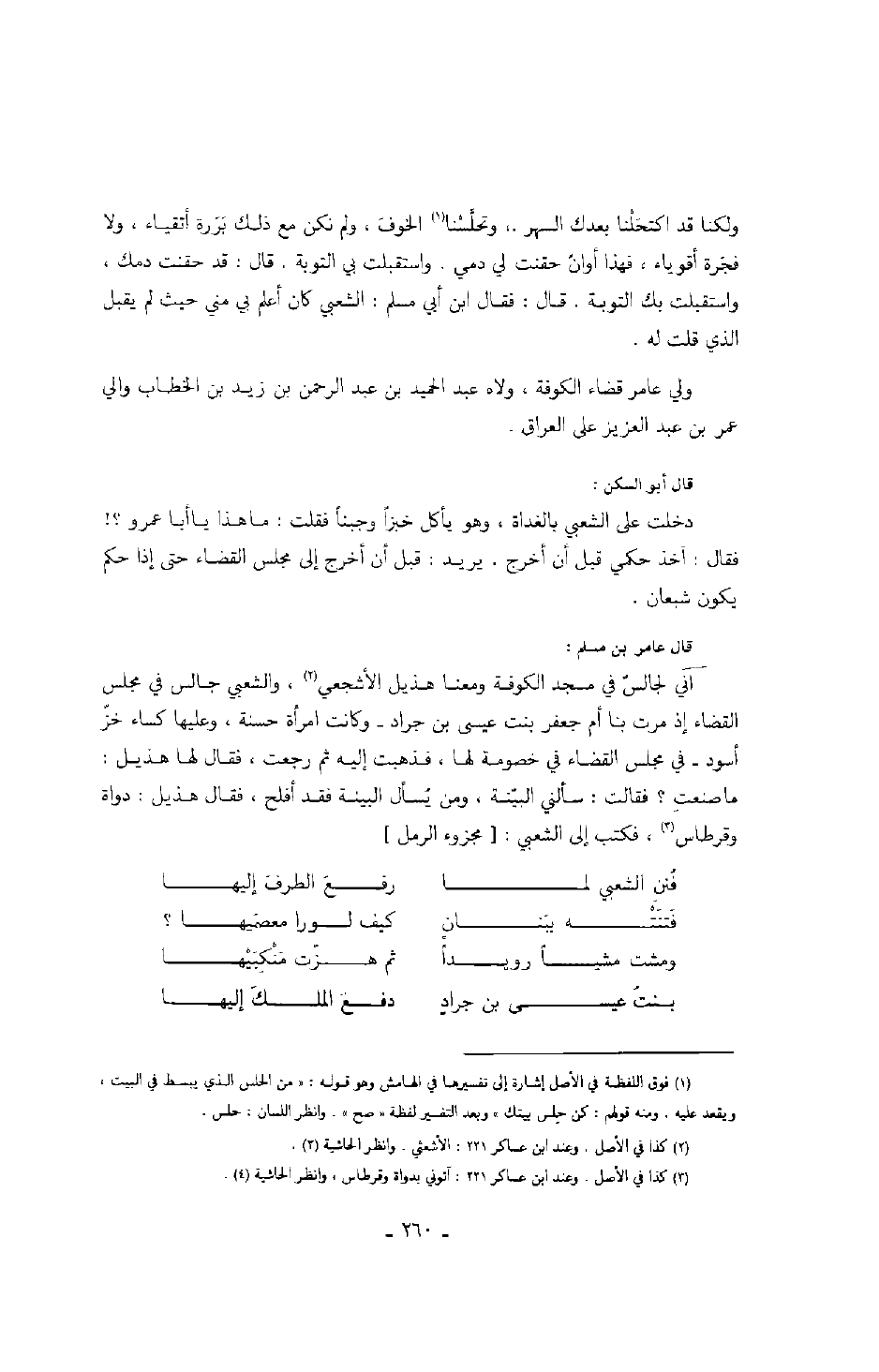 قال عامر بن مسلم: إني لجالسُ في مسجد الكوفة ومعنا هذيل الأشجعي، والشعبي جالس في مجلس القضاء إذ مرت بنا أم جعفر بنت عيسى جراد - وكانت امرأة حسنة، وعليها كساء خزّ أسود - في مجلس القضاء في خصومة لها، فذهبت إليه ثم رجعت، فقال لها هذيل: ما صنعتِ؟ فقالت: سألني البيّنة، ومن يُسأل البينة فقد أفلح، فقال هذيل: دواة وقرطاس، فكتب إلى الشعبي: " مجزوء الرمل "