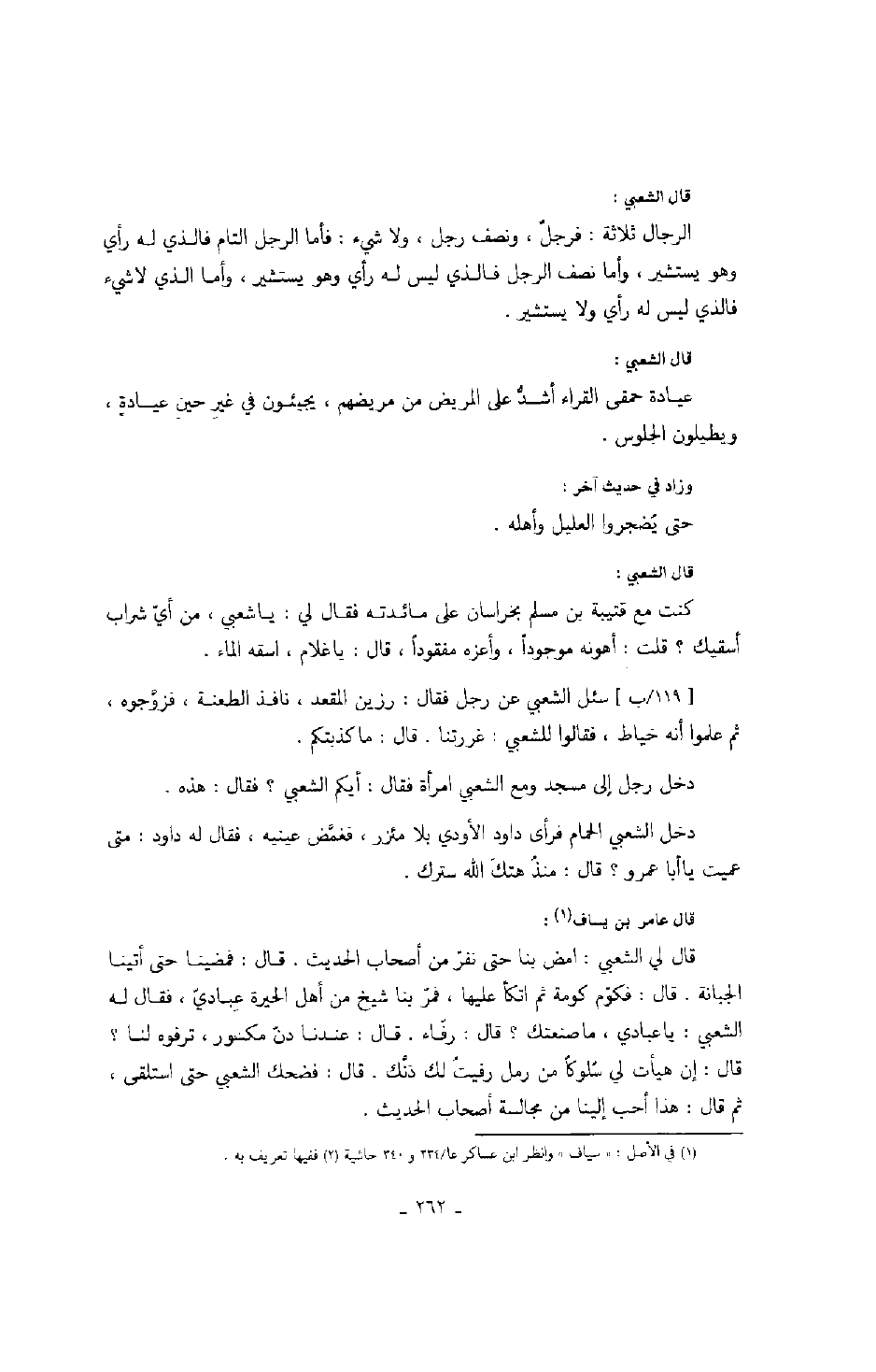 قال الشعبي: الرجال ثلاثة: فرجلٌ، ونصف رجل، ولا شيء: فأما الرجل التام فالذي له رأي وهو يستشير، وأما نصف الرجل فالذي ليس له رأي وهو يستشير، وأما الذي لا شيء فالذي ليس له رأي ولا يستشير.