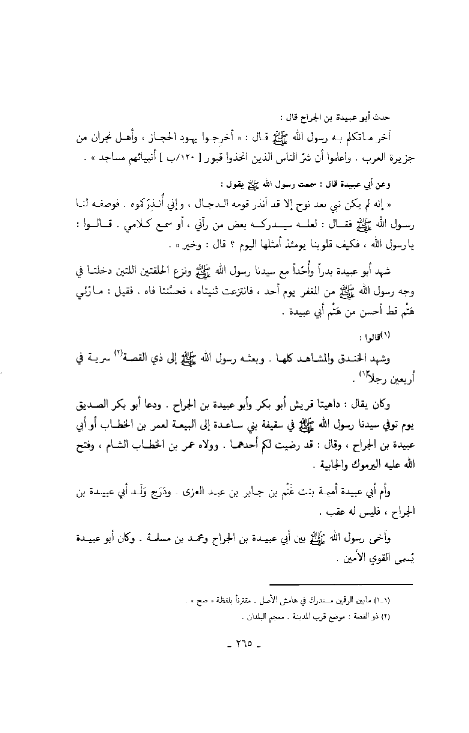 حدث أبو عبيدة بن الجراح قال: آخر ما تكلم به رسول الله صَلَّى اللهُ عَلَيْهِ وَسَلَّمَ قال: " أخرجوا يهود الحجاز، وأهل نجران من جزيرة العرب. واعلموا أن شرّ الناس الذين اتخذوا قبورأنبيائهم مساجد ".