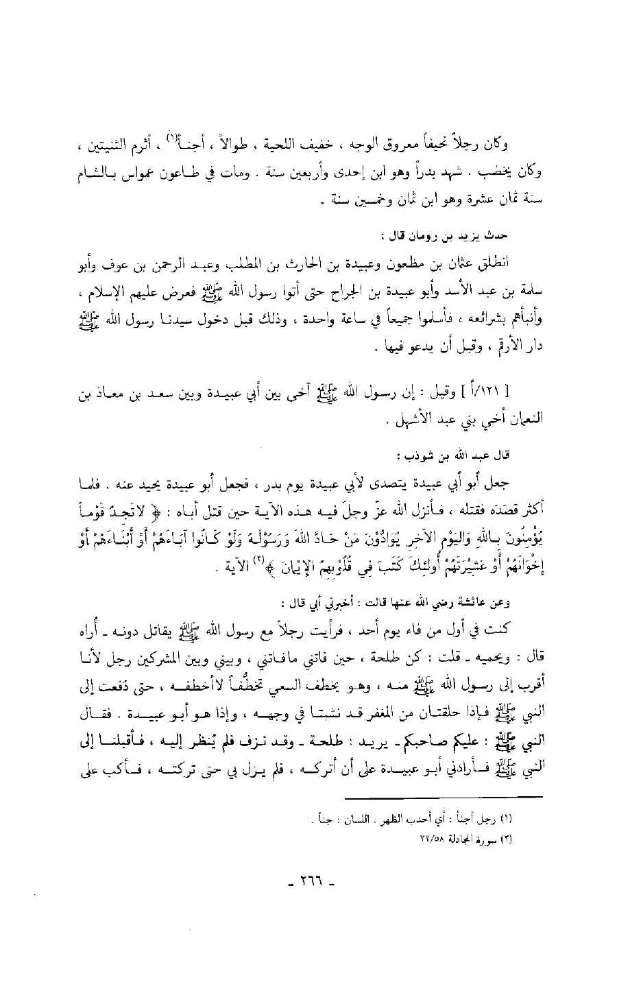 جعل أبو أبي عبيدة يتصدى لأبي عبيدة يوم بدر، فجعل أبو عبيدة يحيد عنه. فلما أكثر قصَدَه فقتله، فأنزل الله عزّ وجلّ فيه هذه الآية حين قتل أباه: " لا تَجِدُ قَوْماً يُؤْمِنُونَ باللهِ وَاليَوْمِ الآخِرِ يُوَادُّوْنَ مَنْ حَادَّ اللهَ وَرَسُولَهُ وَلَوْ كَانُوا آبَاءَهُمْ أوْ أَبْنَاءَهُمْ أوْ إْخْوَانَهُمْ أَوْ عَشيْرَتَهُمْ أُولئِكَ كَتَبَ فِي قُلُوْبِهِمُ الإِيْمانَ " الآية.