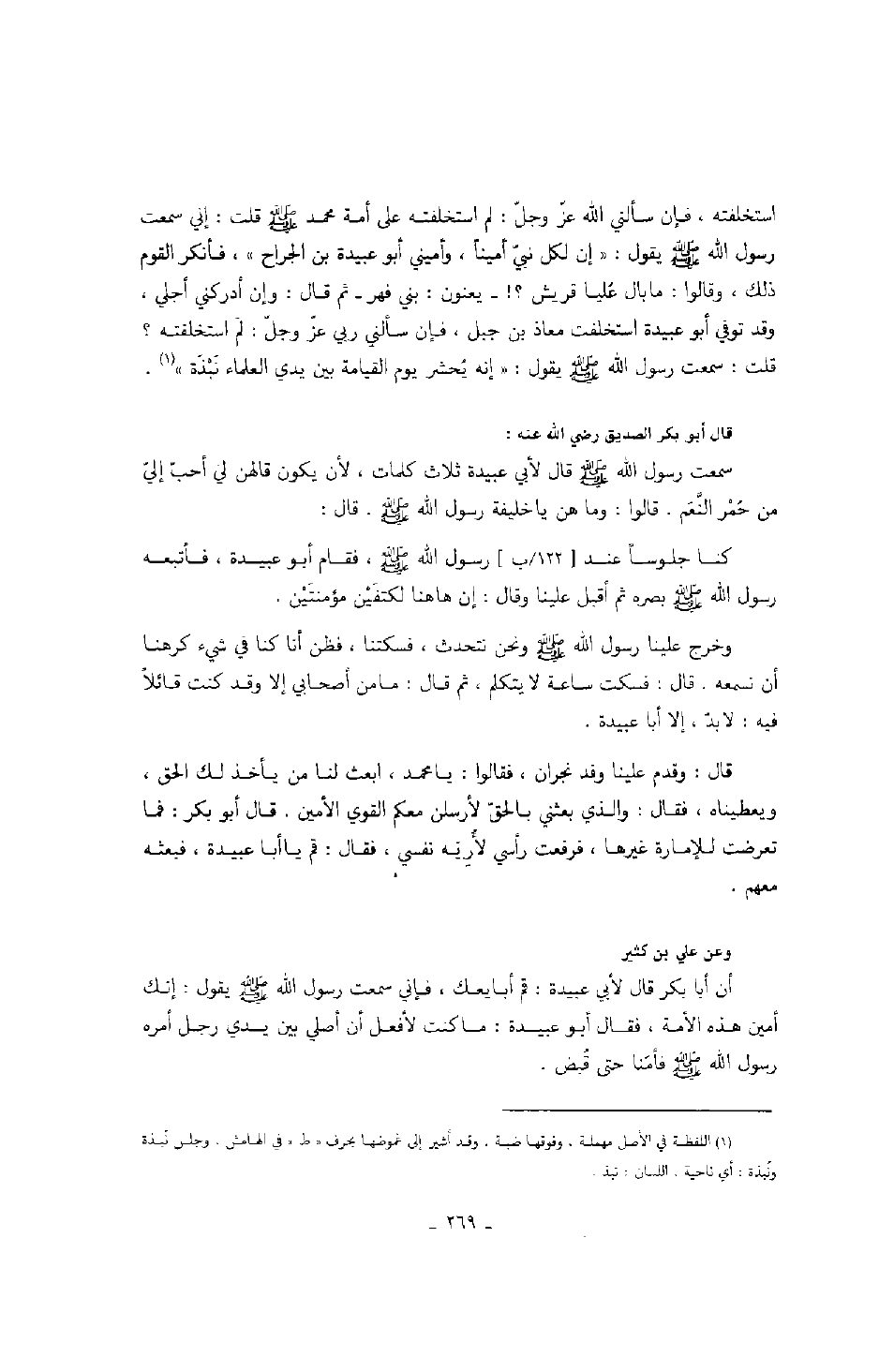 استخلفته، فإن سألني الله عزّ وجلّ: لم استخلفته على أمة محمد صَلَّى اللهُ عَلَيْهِ وَسَلَّمَ قلت: إني سمعت رسول الله صَلَّى اللهُ عَلَيْهِ وَسَلَّمَ يقول: " إن لكل نبيّ أميناً، وأميني أبو عبيدة بن الجراح "، فأنكر القوم ذلك، وقالوا: ما بال عُليا قريش؟! - يعنون: بني فهر ثم قال: وإن أدركني أجلي، وقد توفي أبو عبيدة استخلفت معاذ بن جبل، فإن سألني ربي عزّ وجلّ: لمَ استخلفته "؟ قلت: سمعت رسول الله صَلَّى اللهُ عَلَيْهِ وَسَلَّمَ يقول: " إنه يُحشر يوم القيامة بين يدي العلماء نَبْذَة ".