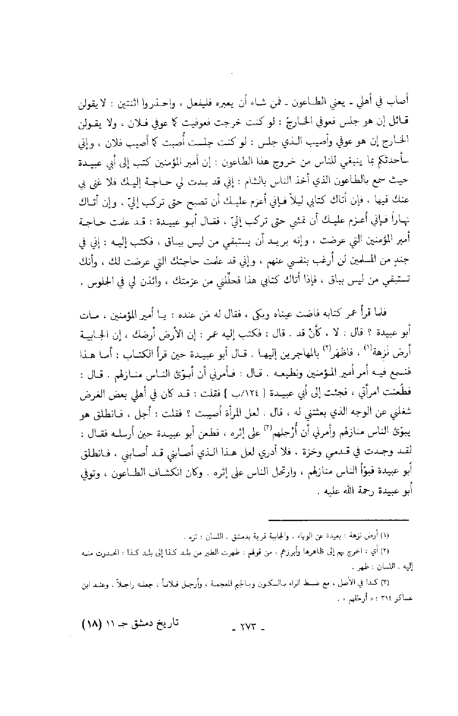 فلما قرأ عمر كتابه فاضت عيناه بكى، فقال له من عند: يا أمير المؤمنين، مات أبو عبيدة؟ قال: لا، كأنْ قد. قال: فكتب إليه عمر: إن الأرض أرضك، إن الجابية أرض نَزِهة، فاظهَر بالمهاجرين إليها. قال أبو عبيدة حين قرأ الكتاب: أما هذا فنسمع فيه أمر أمير المؤمنين ونطيعه. قال: فأمرني أبو أبوىء الناس منازلهم. قال: فطّعنت امرأتي، فجئت إلى أبي عبيدة فقلت: قد كان في أهلي بعض الغرض شغلني عن الوجه الذي بعثتني له، قال. لعل المرأة أصيبت؟ فقلت: أجل، فانطلق هو يبوّىء الناس منازلهم وأمرني أن أُرْجلهم على إثره، فطعن أبو عبيدة حين أرسله فقال: لقد وجدت في قدمي وخزة، فلا أدري لعل هذا الذي أصابني قد أصابني، فانطلق أبو عبيدة فبوّأ الناس منازلهم، وارتحل الناس على إثره. وكان انكشاف الطاعون، وتوفي أبو عبيدة رحمة الله عليه.