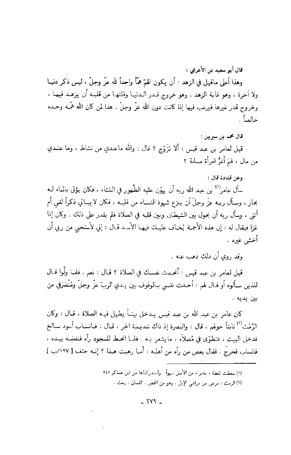كان عامر بن عبد الله بن عبد قيس يدخل بيتاً يطيل فيه الصلاة، قال: وكان الرِّمْث نابتاً حولهم، قال: والبصرة إذ ذاك شديدة الحر، قال: فانساب أسود سالخ فدخل البيت، فتطوّى في مُصلاه، ما يشعر به. فلما انحط للسجود رآه فنفضه بيده، فانساب فخرج. فقال بعض من رآه من أهله: أما رهبت هذا؟ إنه حتف