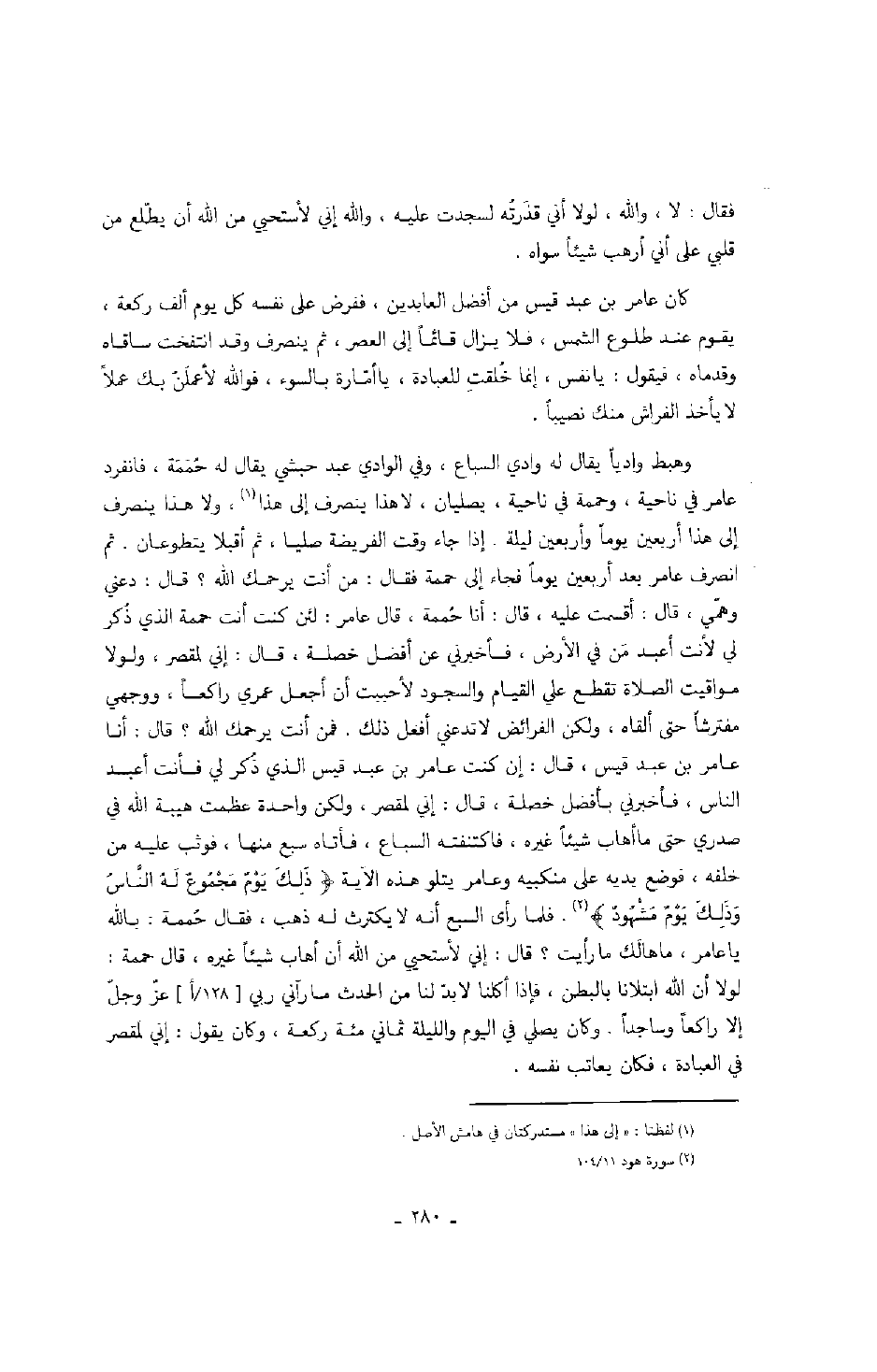 وهبط وادياً يقال له وادي السباع، وفي الوادي عبد حبشي يقال له حُمَمَة، فانفرد عامر في ناحية، وحممة في ناحية، يصليان، لا هذا ينصرف إلى هذا، ولا هذا ينصرف إلى هذا أربعين يوماً وأربعين ليلة. إذا جاء وقت الفريضة صليا، ثم أقبلا يتطوعان. ثم انصرف عامر بعد أربعين يوماً فجاء إلى حممة فقال: من أنت يرحمك الله؟ قال: دعني وهّمي، قال: أقسمت عليه، قال: أنا حُممة، قال عامر: لئن كنت أنت حممة الذي ذُكر لي لأنت أعبد مَن في الأرض، فأخبرني عن أفضل خصلة، قال: إني لمقصر، ولولا مواقيت الصلاة تقطع علي القيام والسجود لأحببت أن أجعل عمري راكعاً، ووجهي مفترشاً حتى ألقاه، ولكن الفرائض لا تدعني أفعل ذلك. فمن أنت يرحمك الله؟ قال: أنا عامر بن عبد قيس، قال: إن كنت عامر بن عبد قيس الذي ذُكر لي فأنت أعبد الناس، فأخبرني بأفضل خصلة، قال: إني لمقصر، ولكن واحدة عظمت هيبة الله في صدري حتى ما أهاب شيئاً غيره، فاكتنفته السباع، فأتاه سبع منها، فوثب عليه من خلقه، فوضع يديه في منكبيه وعامر يتلو هذه الآية: " ذَلِكَ يَوْمٌ مَجْمُوعٌ لهَُ النَّاسُ وَذَلِكَ يَوْمٌ مَشْهُودٌ ". فلما رأى السبع أنه لا يكترث له ذهب، فقال حُممة: بالله يا عامر، ما هالَك ما رأيت؟ قال: إني لأستحيي من الله أن أهاب شيئاً غيره، قال حممة: لولا أن الله ابتلانا بالبطن، فإذا أكلنا لا بدّ لنا من الحدث ما رآني ربي عزّ وجلّ إلا راكعاً وساجداً. وكان يصلي في اليوم والليلة ثماني مئة ركعة، وكان يقول: إني لمقصر في العبادة، فكان يعاتب نفسه.