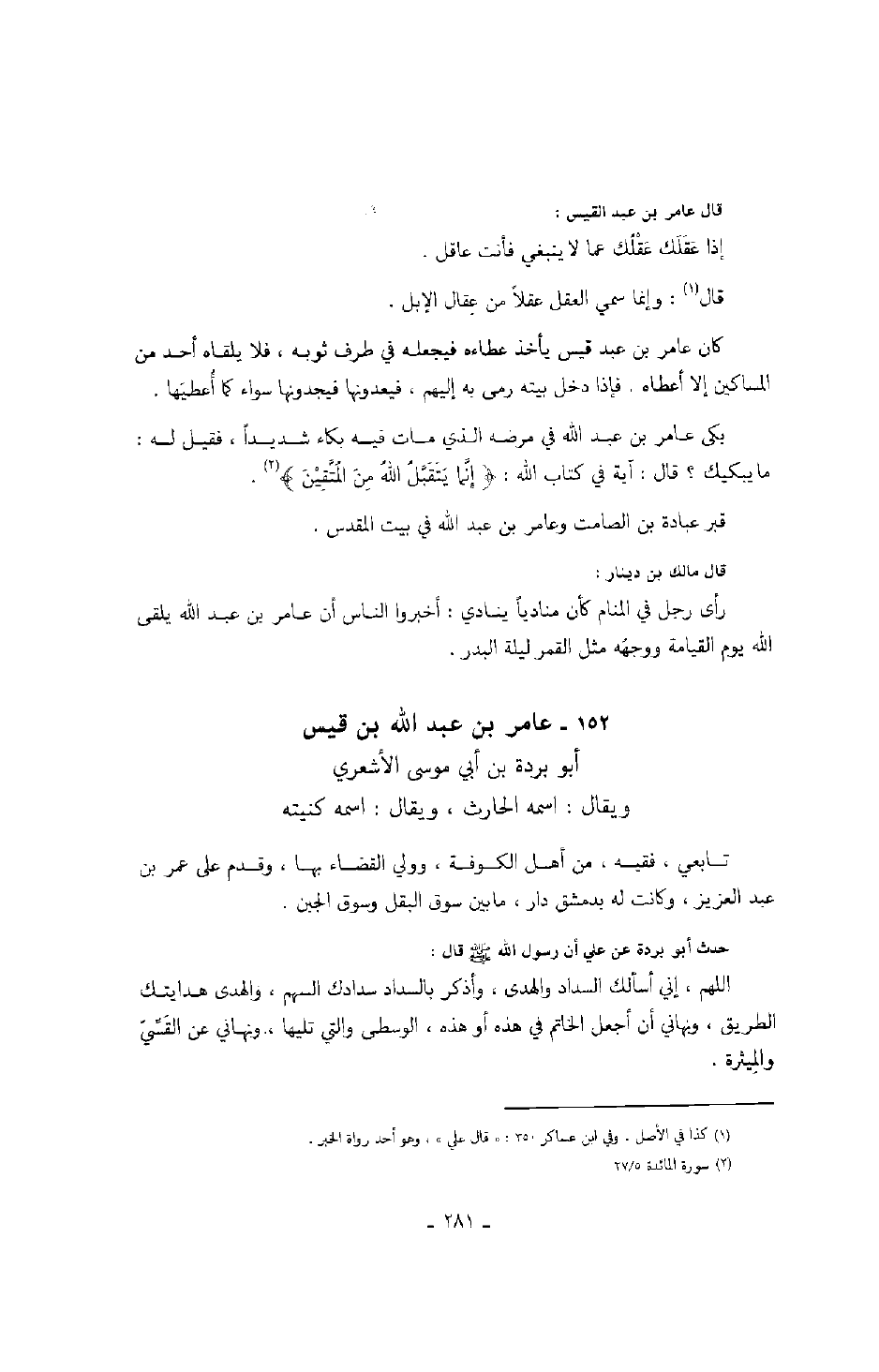 كان عامر بن عبد قيس يأخذ عطاء فيجعله في طرف ثوبه، فلا يلقاه أحد من المساكين إلا أعطاه. فإذا دخل بيته رمى به إليهم، فيعدونها فيجدونها سواء كما أعطيَها.