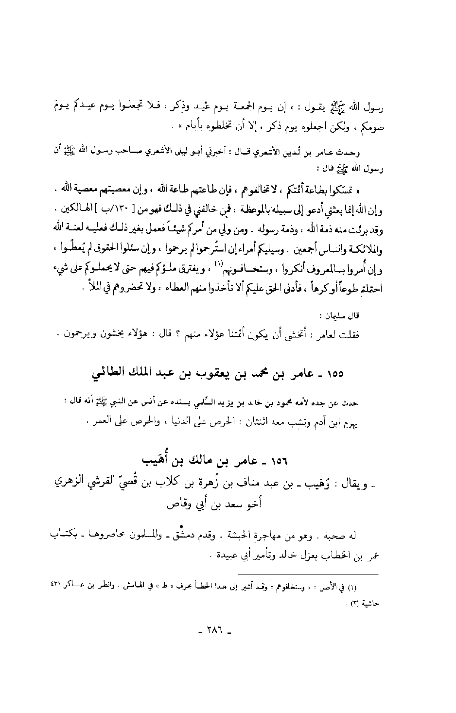 وحدث عامر بن لُدين الأشعري قال: أخبرني أبو ليلى الأشعري صاحب رسول الله صَلَّى اللهُ عَلَيْهِ وَسَلَّمَ أن رسول الله صَلَّى اللهُ عَلَيْهِ وَسَلَّمَ قال: " تمسّكوا بطاعة أئمتكم، لا تخالفوهم، فإن طاعتهم طاعة الله، وإن معصيتهم معصية الله. وإن الله إنما بعثني أدعو إلى سبيله بالموعظة، فمن خالفني في ذلك فهو من الهالكين. وقد برئت منه ذمة الله، وذمة رسوله. ومن ولي من أمركم شيئاً فعمل بغير ذلك فعليه لعنة الله والملائكة والناس أجمعين. وسيليكم أمراء إن استُرحموا لم يرحموا، وإن سئلوا الحقوق لم يُعطُوا، وإن أُمروا بالمعروف أنكروا، وستخافونهم، ويفترق ملؤكم فيهم حتى لا يحملوكم على شيء احتملتم طوعاً أو كرهاً، فأدنى الحق عليكم ألا تأخذوا منهم العطاء، ولا تحضروهم في الملأ ".
