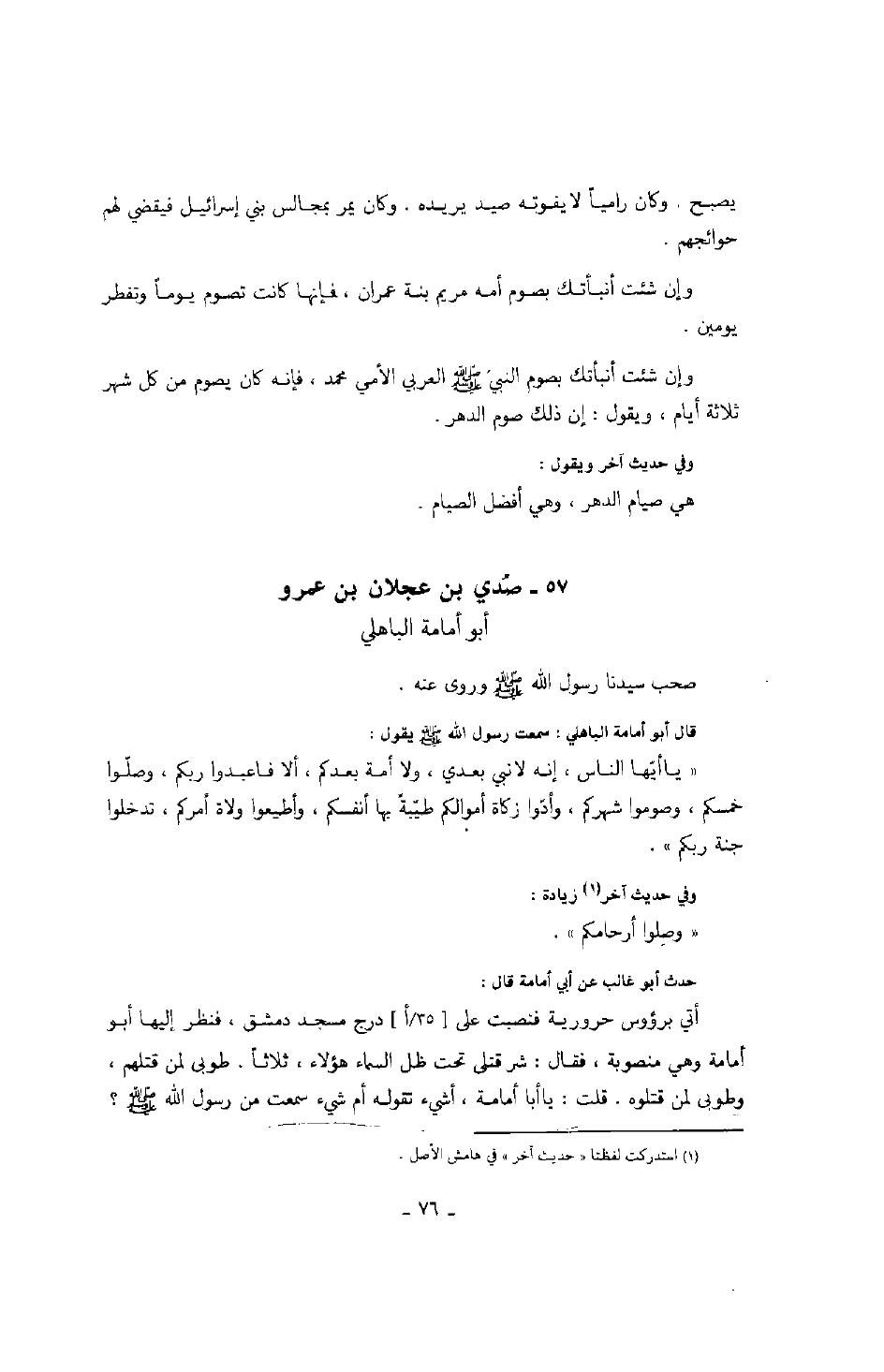 قال أبو أمامة الباهلي: سمعت رسول الله صَلَّى اللهُ عَلَيْهِ وَسَلَّمَ يقول: " يا أيها الناس، إنه لا نبي بعدي، ولا أمة بعدكم، ألا فاعبدوا ربكم، وصلّوا خمسكم وصوموا شهركم، وأدّوا زكاة أموالكم طيّبة بها أنفسكم، وأطيعوا ولاة أمركم، تدخلوا جنة ربكم ".