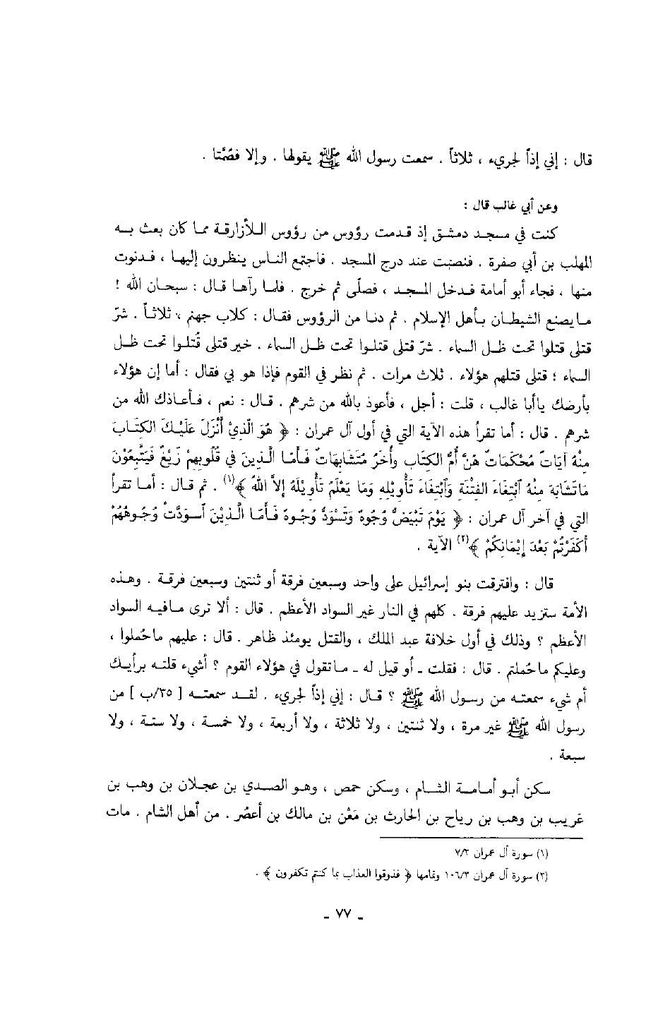 وعن أبي غالب قال: كنت في مسجد دمشق إذ قدمت رؤوس من رؤوس اللأزارقة مما كان بعث به المهلب بن أبي صفرة. فنضبت عند درج المسجد. فاجتمع الناس ينظرون إليها، فدنوت منها، فجاء أبو أمامة فدخل المسجد، فصلّى ثم خرج. فلما رآها قال: سبحان الله! ما يصنع الشيطان بأهل الإسلام. ثم دنا من الرؤوس فقال: كلاب جهنم، ثلاثاً. شرّ قتلى قتلوا تحت ظل السماء. خير قتلى قُتلوا تحت ظل السماء؛ قتلى قتلهم هؤلاء. ثلاث مرات. ثم نظر في القوم فإذا هو بي فقال: أما إن هؤلاء بأرضك يا أبا غالب، قلت: أجل، فأعوذ بالله من شرهم. قال: نعم، فأعوذ بالله من شرهم. قال: أما تقرأ هذه الآية التي في أول آل عمران: " هُوَ الذي أنزلَ عليْكَ الكتابَ مِنْهُ آيَاتٌ مُحْكَمَاتٌ هُنَّ أُمُّ الكِتَاب وأُخَرُ مُتَشَابِهَاتٌ فَأَمّا الذينَ في قُلُوبِهِمْ زَيْغٌ فَيَتَّبِعُوْنَ مَا تَشَابَهَ مِنْهُ ابْتِغَاءَ الفِتْنَةِ وَابْتِغَاءَ تَأْوِيْلِهِ وَمَا يَعْلَمُ تَأْوِيْلَهُ إِلاَّ اللهُ ". ثم قال: أما تقرأ التي في آخر آل عمران: " يَوْمَ تَبْيَضُ وُجُوهٌ وَتَسُوَدُّ وُجُوهٌ فأَمّا الَّذِيْنَ اسوَدَّتْ وُجُوهُهُمْ أَكَفَرْتُمْ بَعْدَ إِيْمَانِكُمْ " الآية.