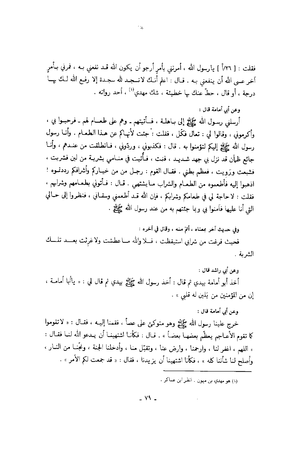 وعن أبي راشد قال: أخد أبو أمامة بيدي ثم قال: أخذ رسول الله صَلَّى اللهُ عَلَيْهِ وَسَلَّمَ بيدي ثم قال لي: " يا أبا أمامة، إن من المؤمنين من يَلين له قلبي ".