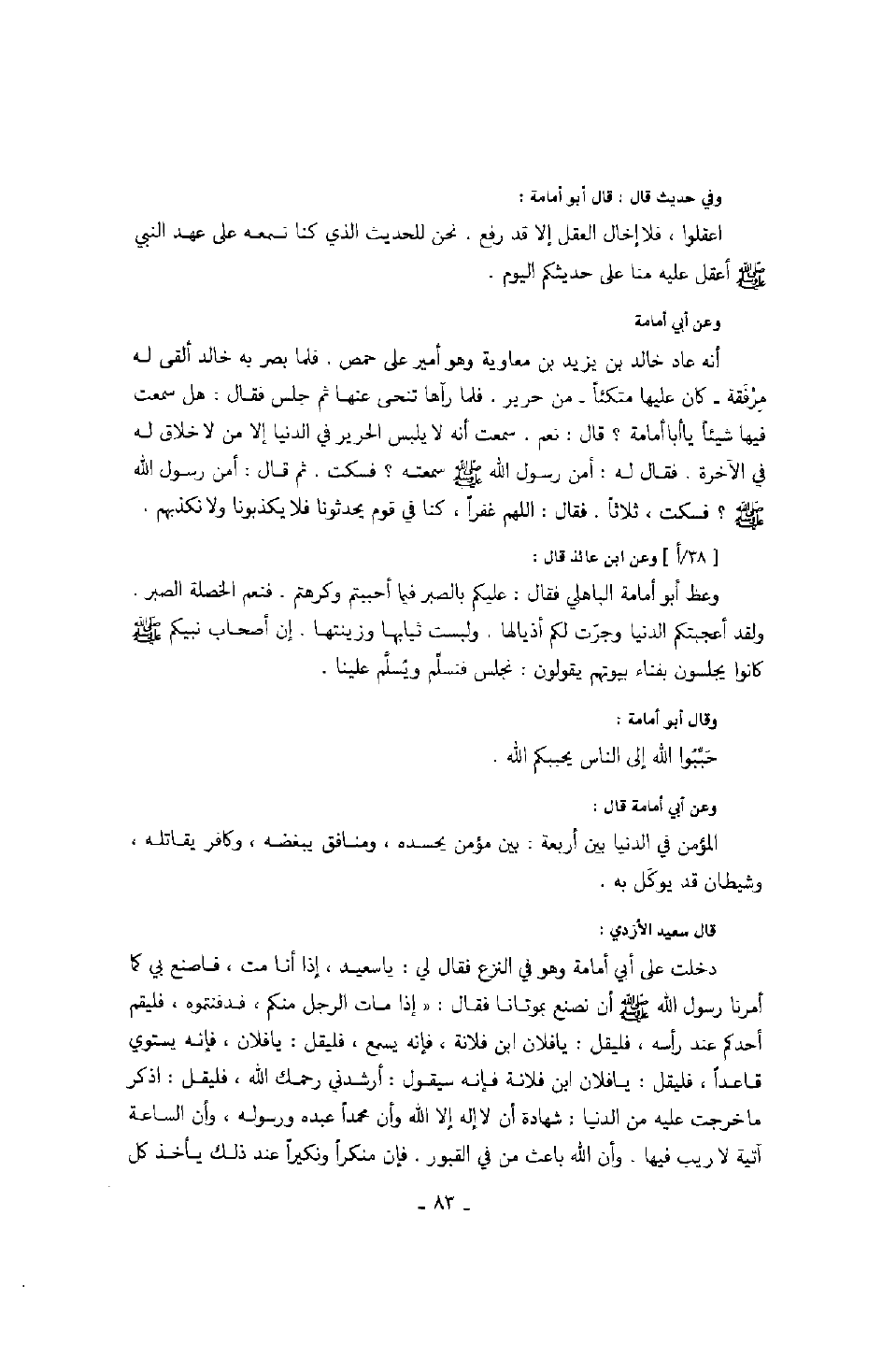 وعن أبي أمامة أنه عاد خالد بن يزيد بن معاوية وهو أمير على حمص. فلما بصر به خالد ألقى له مِرْفَقة - كان عليها متكئاً - من حرير. فلما رآها تنحى عنها ثم جلس فقال: هل سمعت فيها شيئاً يا أبا أمامة؟ قال: نعم. سمعت أنه لا يلبس الحرير في الدنيا إلا من لا خلاق له في الآخرة. فقال له: أمن رسول الله صَلَّى اللهُ عَلَيْهِ وَسَلَّمَ سمعته؟ فسكت. ثم قال: أمن رسول الله صَلَّى اللهُ عَلَيْهِ وَسَلَّمَ؟ فسكت. ثلاثاً. فقال: اللهم غفراً، كنا في قوم يحدثونا فلا يكذبونا ولا نكذبهم.