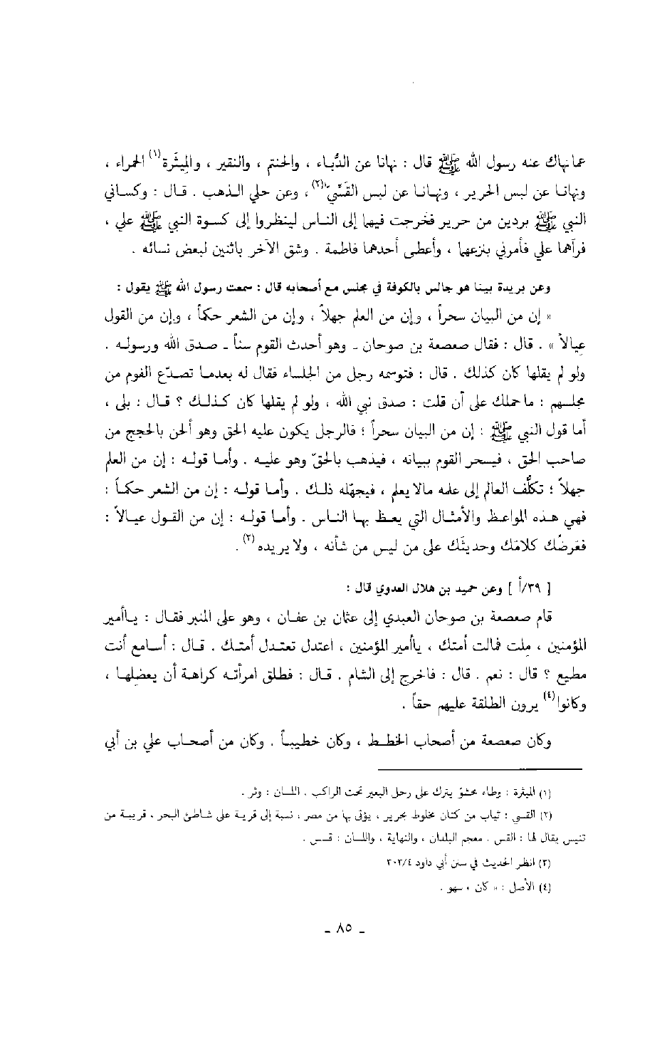 عن بريدة بينا هو جالس بالكوفة في مجلس مع أصحابه قال: سمعت رسول الله صَلَّى اللهُ عَلَيْهِ وَسَلَّمَ يقول: " إن من البيان سحراً، وإن من العلم جهلاً، وإن من الشعر حكماً، وإن من القول عِيالاً ". قال: فقال صعصعة بن صوحان - وهو أحدث القوم سناً - صدق الله ورسوله. ولو لم يقلها كان كذلك: فتوسمه رجل من الجلساء فقال له بعد ما تصدع القوم من مجلسهم: ما حملك على أن قلت: صدق نبي الله، ولو لم يقلها كان كذلك؟ قال: بلى، أما قول النبي صَلَّى اللهُ عَلَيْهِ وَسَلَّمَ: إن من البيان سحراً؛ فالرجل يكون عليه الحق وهو ألحن بالحجج من صاحب الحق، فيسحر القوم ببيانه، فيذهب بالحقّ وهو عليه. وأما قوله: إن من العلم صاحب جهلاً؛ تكلُّف العالم إلى علمه ما لا يعلم، فيجهّله ذلك. وأما قوله: إن من الشعر حكماً: فهي هذه المواعظ والأمثال التي يعظ بها الناس. وأما قوله: إن من القول عيالاً: فعَرضُك كلامَك وحديثَك على من ليس من شأنه، ولا يريده.