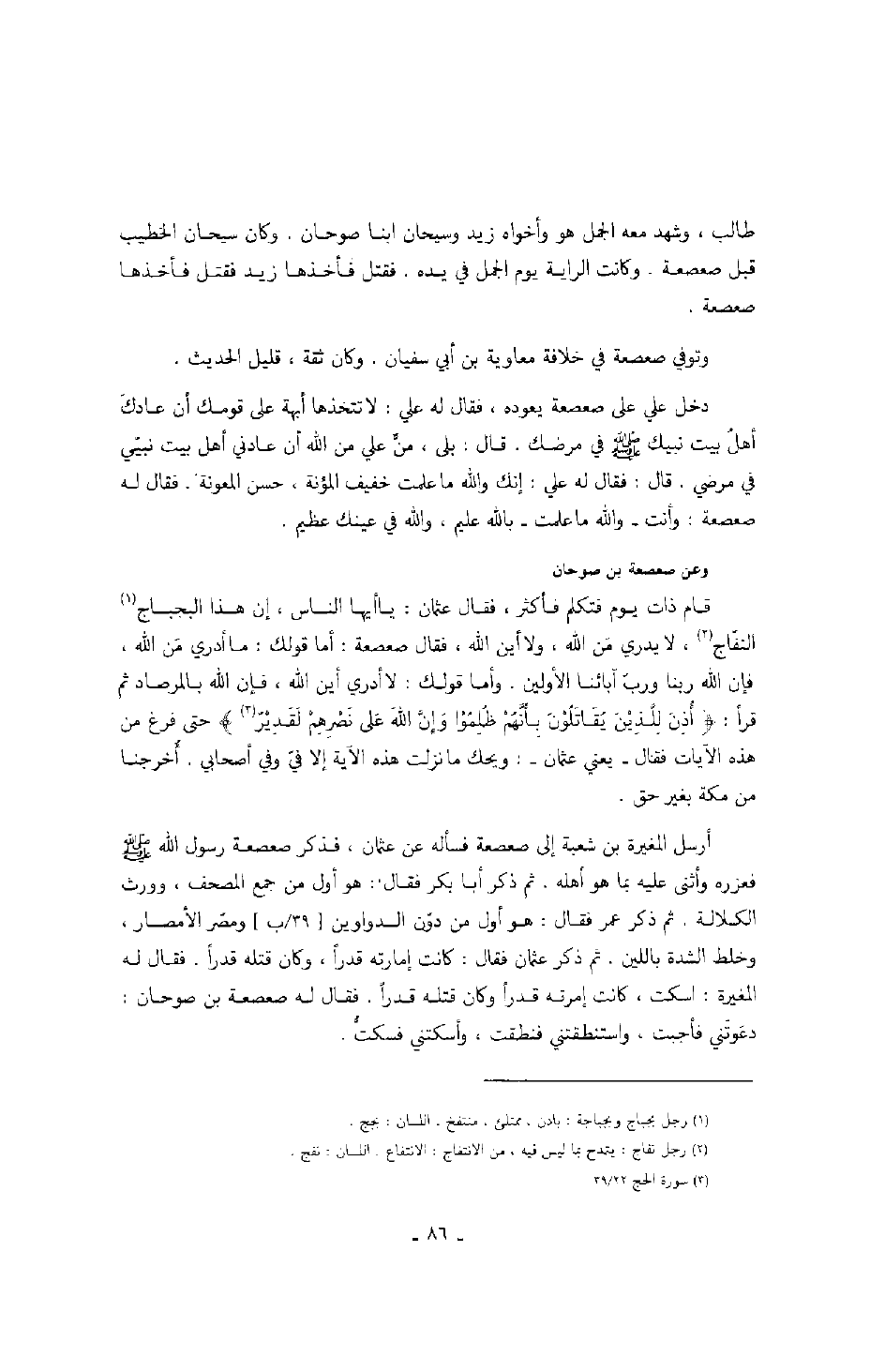 وعن صعصعة بن صوحان قام ذات يوم فتكلم فأكثر، فقال عثمان: يا أيها الناس، إن هذا البجباج النفّاج، لا يدري من الله، ولا أين الله، فقال صعصعة: أما قولك: ما أدري مَن الله، فإن الله ربنا وربّ أبائنا الأولين. وأما قولك: لا أدري أين الله، فإن الله بالمرصاد ثم قرأ: " أُذِنَ لِلَّذِينَ يُقَاتَلُونَ بِأَنَّهُمْ ظُلِمُوْا وَإِنَّ اللهَ عَلى نَصْرِهِمْ لَقَدِيْرٌ " حتى فرغ من هذه الآيات فقال - يعني عثمان -: ويحك ما نزلت هذه الآية إلا فيّ وفي أصحابي. أُخرجنا من مكة بغير حق.