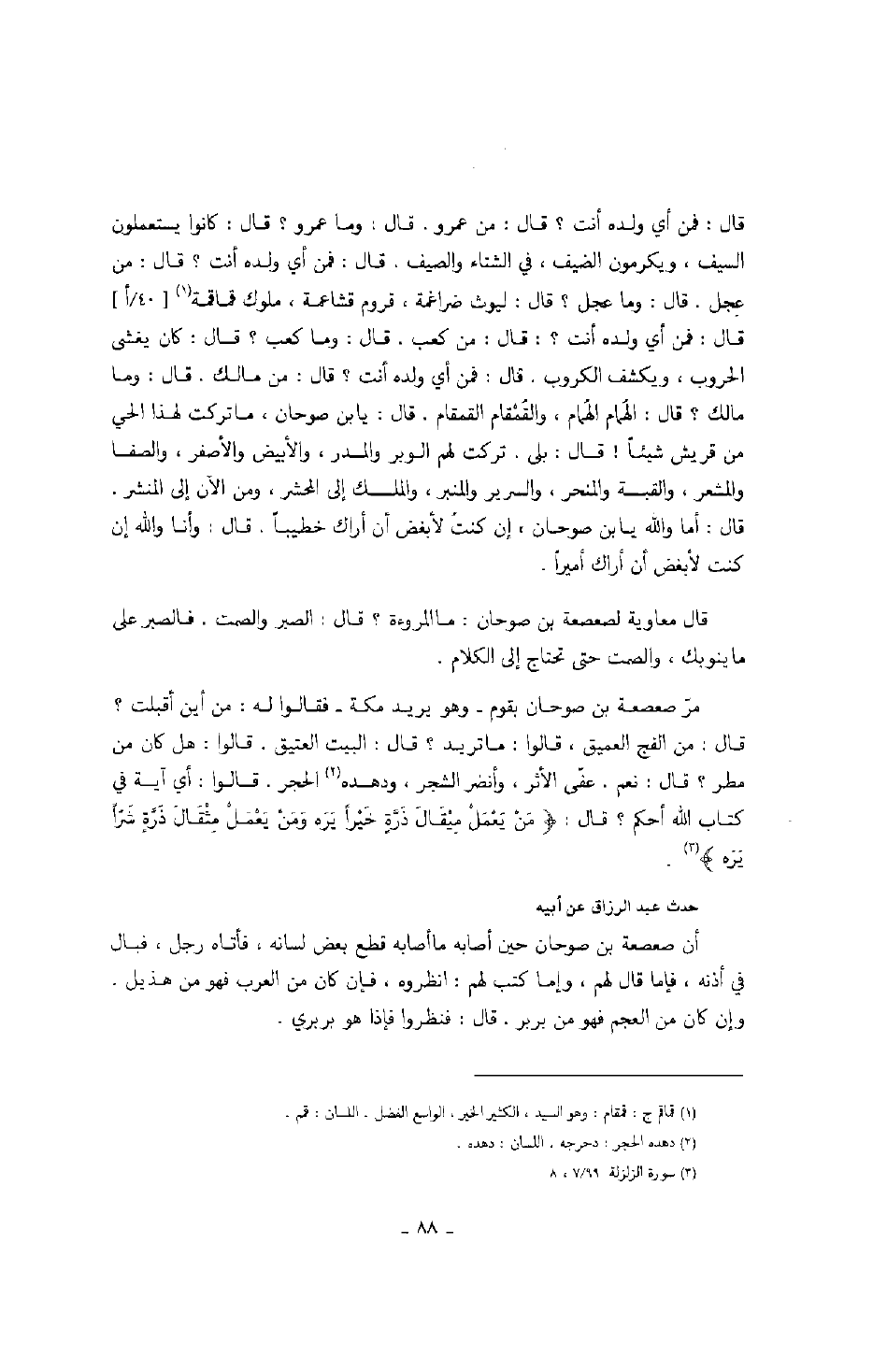 قال: فمن أي ولده أنت؟ قال: من عمرو. قال: وما عمرو؟ قال: كانوا يستعملون السيف، ويكرمون الضيف، في الشتاء والصيف. قال: فمن أي ولده أنت؟ قال: من عجل. قال: وما عجل؟ قال: ليوث ضراغمة، قروم قشاعمة، ملوك قماقمة قال: فمن أي ولده أنت؟: قال: من كعب. قال: وما كعب؟ قال: كان يغشى الحروب، ويكشف الكروب. قال: فمن أي ولده أنت؟ قال: من مالك. قال: وما مالك؟ قال: الهُمام الهُمام، والقُمقام. قال: يا بن صوحان، ما تركت لهذا الحي من قريش شيئاً! قال: بلى. تركت لهم الوبر والمدر، والأبيض والأصفر، والصفا والمشعر، والقبة والمنحر، والسرير والمنبر، والملك إلى المحشر، ومن الآن إلى المنشر. قال: أما والله يا بن صوحان، إن كنت لأبغض أن أراك خطيباً. قال: وأنا والله إن كنت لأبغض أن أراك أميراً.