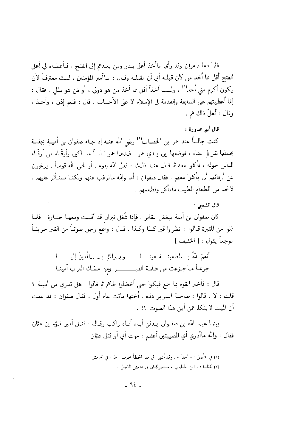 فلما دعا صفوان وقد رأى ما أخذ أهل بدر ومن بعدهم إلى الفتح، فأعطاه في أهل الفتح أقل مما أخذ من كان قبله أبى أن يقبله وقال: يا أمير المؤمنين، لست معترفاً لأن يكون أكرم مني أحد، ولست آخذاً أقل مما أخذ من هو دوني، أو من هو مثلي. فقال: إنما أعطيتهم على السابقة والقدِيمة في الإسلام لا على الأحساب. قال: فنعم إذن، وأخذ، وقال: أهلُ ذاك هم.