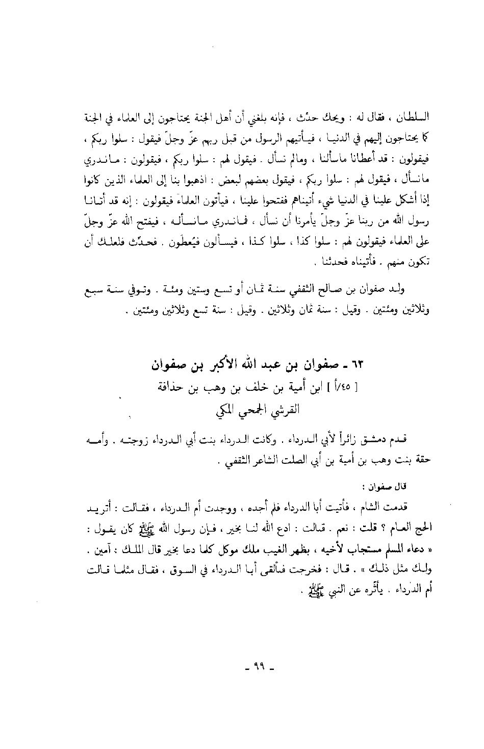 قال صفوان: قدمت الشام، فأتيت أبا الدرداء فلم أجده، ووجدت أم الدرداء، فقالت: أتريد الحج العام؟ قلت: نعم. قالت: ادع الله لنا بخير، فإن رسول الله صَلَّى اللهُ عَلَيْهِ وَسَلَّمَ كان يقول: " دعاء المسلم مستجاب لأخيه، بظهر الغيب ملك موكل كلما دعا بخير قال الملك: آمين. ولك مثل ذلك ". قال: فخرجت فألقى أبا الدرداء في السوق، فقال مثلما قالت أم الدرداء. يأثُره عن النبي صَلَّى اللهُ عَلَيْهِ وَسَلَّمَ.