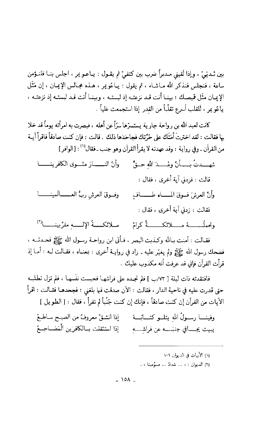 كانت لعبد الله بن رواحة جارية يستسرها سراً عن أهله، فبصرت به امرأته يوماً قد خلا بها فقالت: لقد اخترت أمتك على حرتك فجاحدها ذلك: فقالت: فإن كنت صادقاً فاقرأ آية من القرآن - وفي رواية: وقد عهدته لا يقرأ القرآن وهو جنب - فقال: