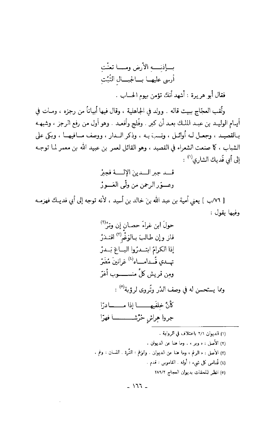 ولقب العجاج ببيت قاله. وولد في الجاهلية، وقال فيها أبياتاً من رجزه، ومات في أيام الوليد بن عبد الملك بعد أن كبر، وفلج وأقعد. وهو أول من رفع الرجز، وشبهه بالقصيد، وجعل له أوائل، ونسب به، وذكر الدار، ووصف ما فيها، وبكى على الشباب، كما صنعت الشعراء في القصيد، وهو القائل لعمر بن عبيد الله بن معمر لما توجه إلى أبي فديك الشاري: