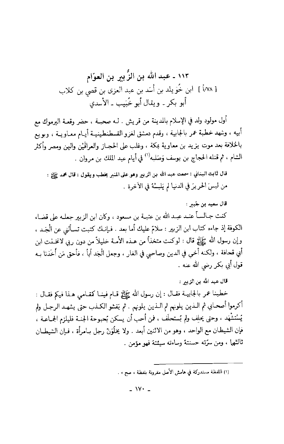 قال ثابت البناني: سمعت عبد الله بن الزبير وهو على المنبر يخطب ويقول: قال محمد صَلَّى اللهُ عَلَيْهِ وَسَلَّمَ: من لبس الحرير في الدنيا لم يلبسه في الآخرة.
