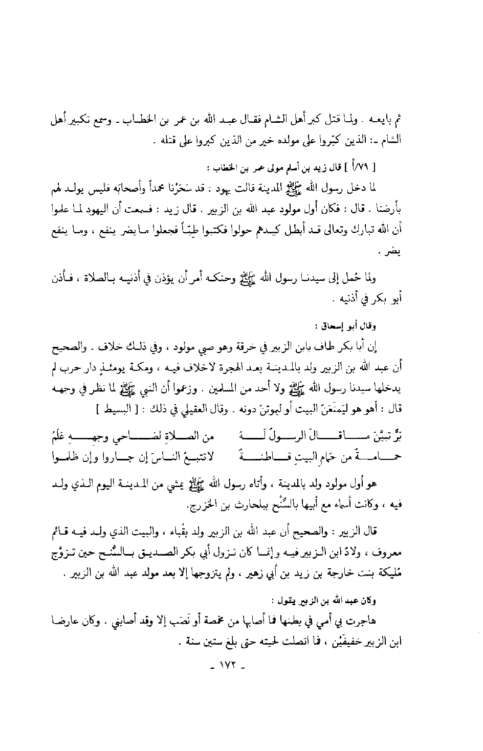 وقال أبو إسحاق: إن أبا بكر طاف بابن الزبير في خرقة وهو صبي مولود، وفي ذلك خلاف. والصحيح أن عبد الله بن الزبير ولد بالمدينة بعد الهجرة لا خلاف فيه، ومكة يومئذ دار حرب لم يدخلها سيدنا رسول الله صَلَّى اللهُ عَلَيْهِ وَسَلَّمَ ولا أحد من المسلمين. وزعموا أن النبي صَلَّى اللهُ عَلَيْهِ وَسَلَّمَ لما نظر في وجهه قال: أهو هو ليمنعن البيت أو ليموتن دونه. وقال العقيلي في ذلك: