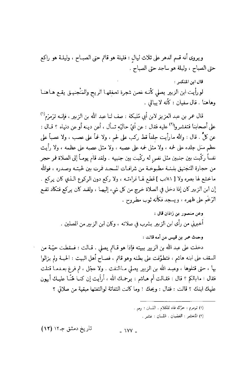 قال ابن المنكدر: لو رأيت ابن الزبير يصلي كأنه غصن شجرة تصفقها الريح والمنجنيق يقع هاهنا وهاهنا. قال سفيان: كأنه لا يبالي.