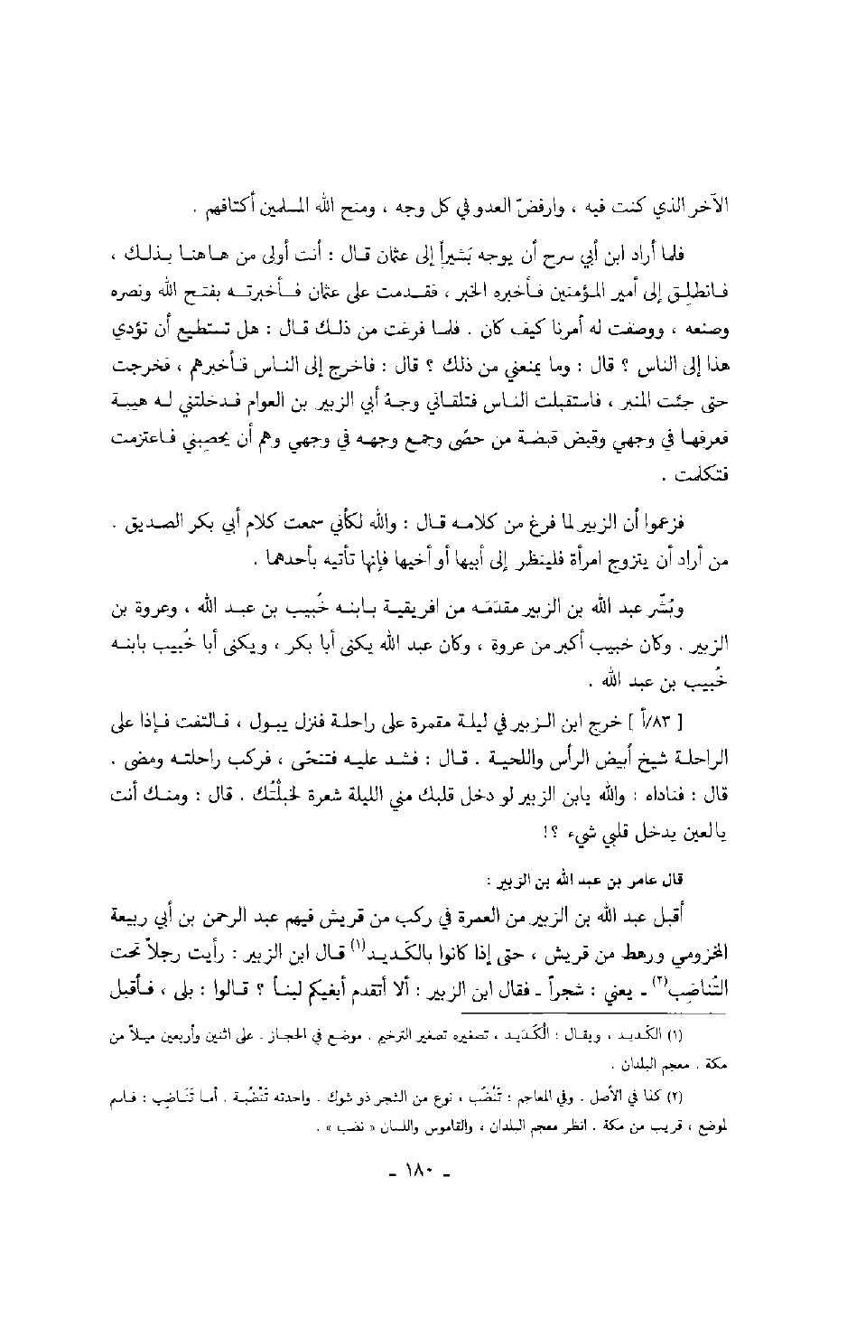 خرج ابن الزبير في ليلة مقمرة على راحلة فنزل يبول، فالتفت فإذا على الراحلة شيخ أبيض الرأس واللحية. قال: فشد عليه فتنحى، فركب راحلته ومضى. قال: فناداه: والله يا بن الزبير لو دخل قلبك مني الليلة شعرة لخبلتك. قال: ومنك أنت يا لعين يدخل قلبي شيء؟! قال عامر بن عبد الله بن الزبير: أقبل عبد الله بن الزبير من العمرة في ركب من قريش فيهم عبد الرحمن بن أبي ربيعة المخزومي ورهط من قريش، حتى إذا كانوا بالكديد قال ابن الزبير: رأيت رجلاً تحت التناضب - يعني: شجراً - فقال ابن الزبير: ألا أتقدم أبغيكم لبناً؟ قالوا: بلى، فأقبل