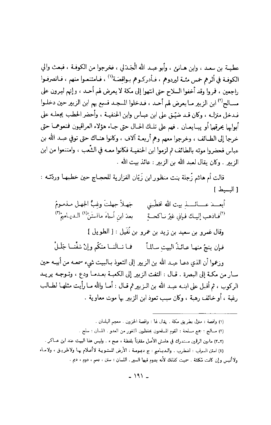 عطية بن سعيد، وابن هانئ، وأبو عبد الله الجدلي، فخرجوا من الكوفة، فبعث والي الكوفة في أثرهم خمس مئة ليردوهم، فأدركوهم بواقصة، فامتنعوا منهم، فانصرفوا راجعين، فمروا وقد أخفوا السلاح حتى انتهوا إلى مكة لا يعرض لهم أحد، وإنهم ليمرون على مسالح ابن الزبير ما يعرض لهم أحد، فدخلوا المسجد فسمع بهم ابن الزبير حين دخلوا فدخل منزله، وكان قد ضيق على ابن عباس وابن الحنفية، وأحضر الحطب يجعله على أبوابها يحرقهما أو يبايعان. فهم على تلك الحال حتى جاء هؤلاء العراقيون فمنعوهما حتى خرجا إلى الطائف، وخرجوا معهم وهم أربعة آلاف، وكانوا هناك حتى توفي عبد الله بن عباس فحضروا موته بالطائف ثم لزموا ابن الحنفية فكانوا معه في الشعب، وامتنعوا من ابن الزبير. وكان يقال لعبد الله بن الزبير: عائذ بيت الله.