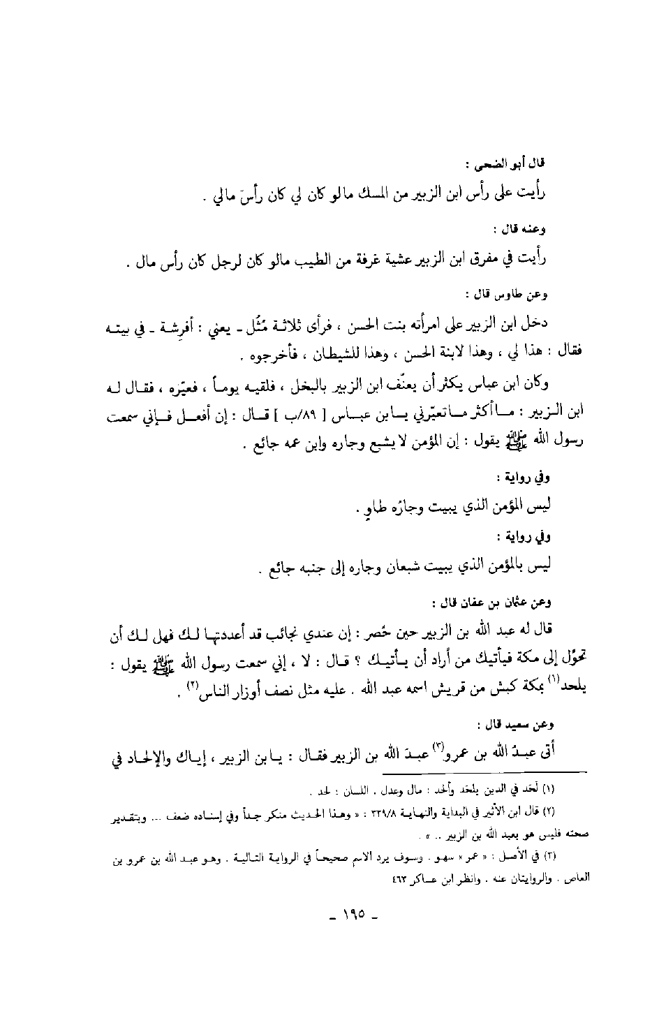 وكان ابن عباس يكثر أن يعنف ابن الزبير بالبخل، فلقيه يوماً، فعيره، فقال له ابن الزبير: ما أكثر ما تعيرني يا بن عباس قال: إن أفعل فإني سمعت رسول الله صَلَّى اللهُ عَلَيْهِ وَسَلَّمَ يقول: إن المؤمن لا يشبع وجاره وابن عمه جائع.