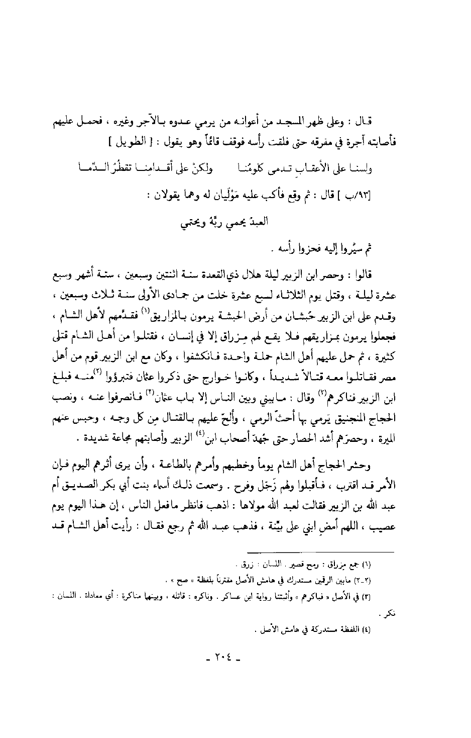 قالوا: وحصر ابن ليلة هلال ذي العقدة سنة اثنتين وسبعين، ستة أشهر وسبع عشرة ليلة، وقتل يوم الثلاثاء لسبع عشرة خلت من جمادى الأولى سنة ثلاث وسبعين، وقدم على ابن الزبير حبشان من أرض الحبشة يرمون بالمزاريق فقدمهم لأهل الشام، فجعلوا يرمون بمزاريقهم فلا يقع لهم مزراق إلا في إنسان، فقتلوا من أهل الشام قتلى كثيرة، ثم حمل عليهم أهل الشام حملة واحدة فانكشفوا، وكان مع ابن الزبير قوم من أهل مصر فقاتلوا معه قتالاً شديداً، وكانوا خوارج حتى ذكروا عثمان فتبرؤوا منه فبلغ ابن الزبير فناكرهم وقال: ما بيني وبين الناس إلا باب عثمان فانصرفوا عنه، ونصب الحجاج المنجنيق يرمي بها أحث الرمي، وألح عليهم بالقتال من كل وجه، وحبس عنهم الميرة، وحصرهم أشد الحصار حتى جهد أصحاب ابن الزبير وأصابتهم مجاعة شديدة.