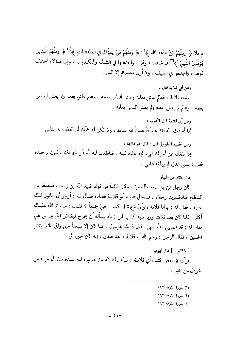 وعن أبي قلابة قال: العلماء ثلاثة: فعالم عاش بعلمه وعاش بعلمه وعاش الناس بعلمه، وعالم عاش بعلمه ولم يعش الناس بعلمه، وعالم لم بعلمه ولم يعش الناس بعلمه.