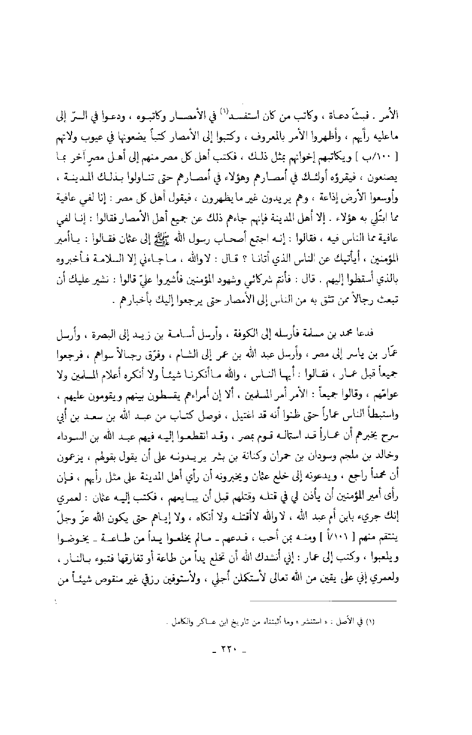 فدعا محمد بن مسلمة فأرسله إلى الكوفة، وأرسل أسامة بن زيد إلى البصرة، وأرسل عمار بن ياسر إلى مصر، وأرسل عبد الله بن عمر إلى الشام، وفرق رجالاً سواهم، فرجعوا جميعاً قبل عمار، فقالوا: أيها الناس، والله ما أنكرنا شيئاً ولا أنكره أعلام المسلمين ولا عوامهم، وقالوا جميعاً: الأمر أمر المسلمين، ألا إن أمراءهم يقسطون بينهم ويقومون عليهم، واستبطأ الناس عماراً حتى ظنوا أنه قد اغتيل، فوصل كتاب منعبد الله بن سعد بن أبي سرح يخبرهم أن عماراً قد استماله قوم بمصر، وقد انقطعوا إليه فيهم عبد الله بن السوداء وخالد بن ملجم وسودان بن حمران وكنانة بن بشر يريدونه على أن يقول بقولهم، يزعمون أن محمداً راجع، ويدعونه إلى خلع عثمان ويخبرونه أن رأي أهل المدينة على مثل رأيهم، فإن رأى أمير المؤمنين أن يأذن لي في قتله وقتلهم قبل أن يبايعهم، فكتب إليه عثمان: لعمري إنك جريء بابن أم عبد الله، لا والله لا أقتله ولا أنكاه، ولا إياهم حتى يكون الله عز وجل ينتقم منهم ومنه بمن أحب، فدعهم - ما لم يخلعوا يداً من طاعة - يخوضوا ويلعبوا، وكتب إلى عمار: إني أنشدك الله أن تخلع يداً من طاعة أو تفارقها فتبوء بالنار، ولعمري إني على يقين من الله تعالى لأستكملن أجلي، ولأستوفين رزقي غير منقوص شيئاً من