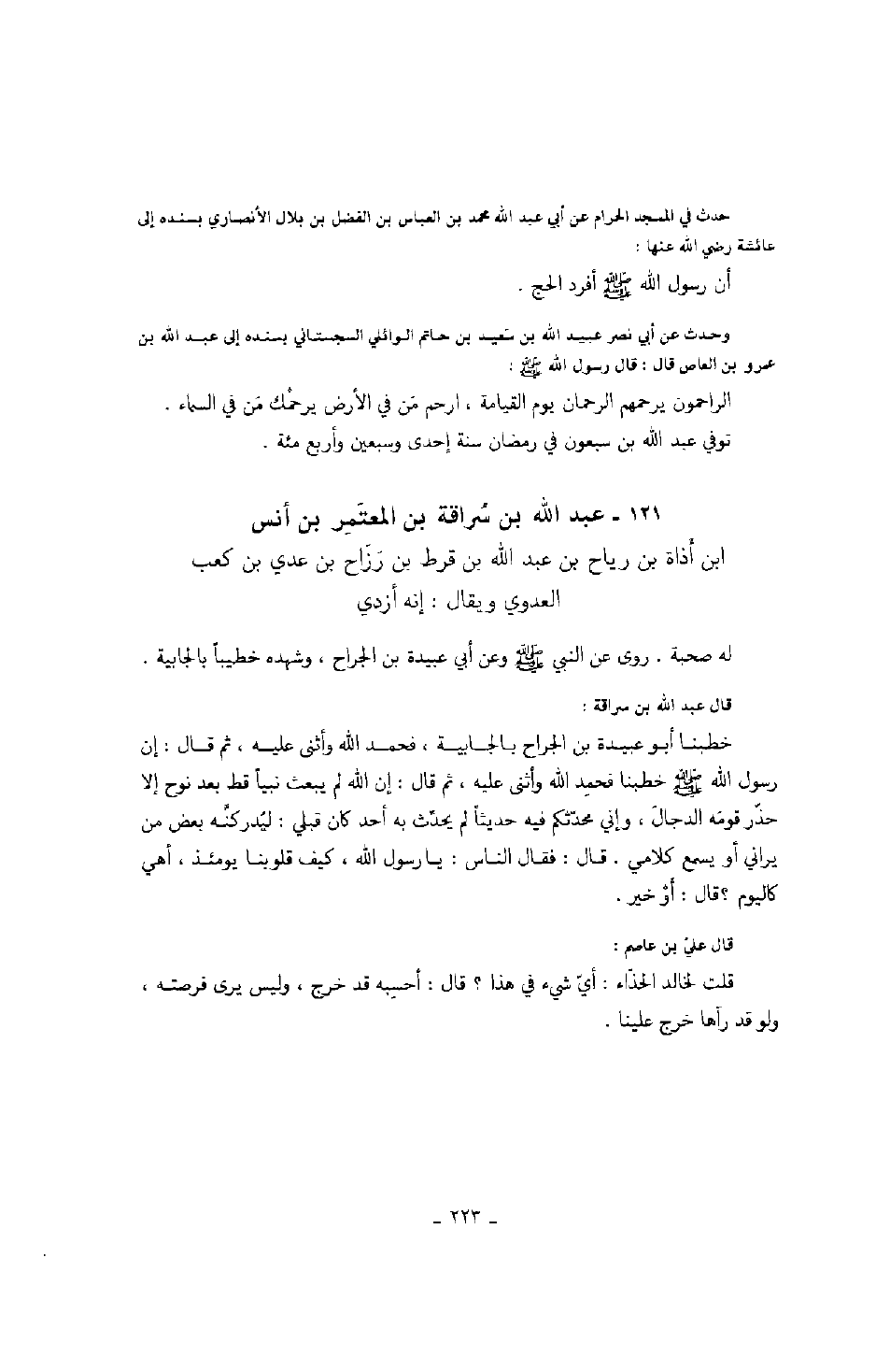 حدث في المسجد الحرام عن أبي عبد الله محمد بن العباس بن الفضل بن بلال الأنصاري بسنده إلى عائشة رضي الله عنها: أن رسول الله صَلَّى اللهُ عَلَيْهِ وَسَلَّمَ أفرد الحج.