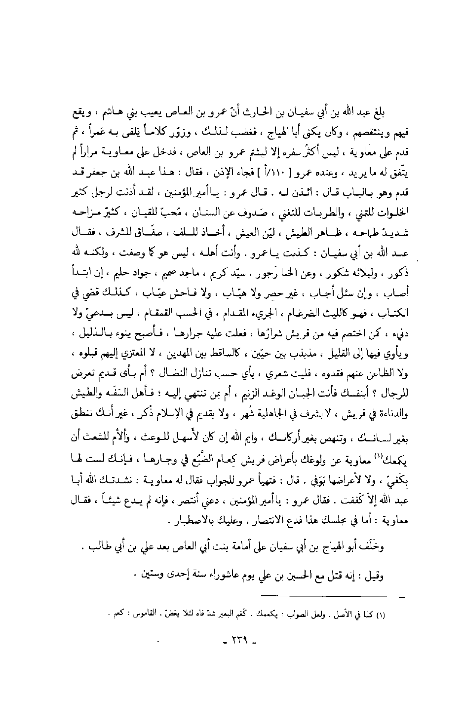 بلغ عبد الله بن أبي سفيان بن الحارث أن عمرو بن العاص يعيب بني هاشم، ويقع فيهم وينتفضهم، وكان يكنى أبا الهياج، فغضب لذلك، وزور كلاماً يلقى به عمراً، ثم قدم على معاوية، ليس أكثر سفره إلا ليشتم عمرو بن العاص، فدخل على معاوية مراراً لم يتفق له ما يريد، وعنده عمرو فجاء الإذن، فقال: هذا عبد الله بن جعفر قد قدم وهو بالباب قال: ائذن له. قال عمرو: يا أمير المؤمنين، لقد أذنت لرجل كثير الخلوات للتمني، والطربات للتغني، صدوف عن السنان، محب للقيان، كثير مزاحه شديد طماحه، ظاهر الطيش، لين العيش، أخاذ للسلف، صفاق للشرف، فقال عبد الله بن أبي سفيان: كذبت يا عمرو. وأنت أهله، ليس هو كما وصفت، ولكنه لله ذكور، ولبلائه شكور، وعن الخنا زجور، سيد كريم، ماجد صميم، جواد حليم، إن ابتدأ أصاب، وإن سئل أجاب، غير حصر ولا هياب، ولا فاحش عياب، كذلك قضي في الكتاب، فهو كالليث الضرغام، الجريء المقدام، في الحسب القمقام، ليس بدعي ولا دنيء، كمن اختصم فيه من قريش شرارها، فعلت عليه جرارها، فأصبح ينوء بالذليل، ويأوي فيها إلى القليل، مذبذب بين حيين، كالساقط بين المهدين، لا المعتزي إليهم قبلوه، ولا الظاعن عنهم فقدوه، فليت شعري، بأي حسب تنازل النضال؟ أم بأي قديم تعرض للرجال؟ أبنفسك فأنت الجبان الوغد الزنيم، أم بمن تنتهي إليه؛ فأهل السفه والطيش والدناءة في قريش، لا بشرف في الجاهلية شهر، ولا بقديم في الإسلام ذكر، غير أنك تنطق بغير لسانك، وتنهض بغير أركانك، وايم الله إن كان لأسهل للوعث، وألأم للشعث أن يكمعك معاوية عن ولوغك بأعراض قريش كعام الضبع في وجارها، فإنك لست لها بكفي، ولا لأعراضها بوفي. قال: فتهيأ عمرو للجواب فقال له معاوية: نشدتك الله أبا عبد الله إلا كففت. فقال عمرو: يا أمير المؤمنين، دعني أنتصر، فإنه لم يدع شيئاً، فقال معاوية: أما في مجلسك هذا فدع الانتصار، وعليك بالاصطبار.