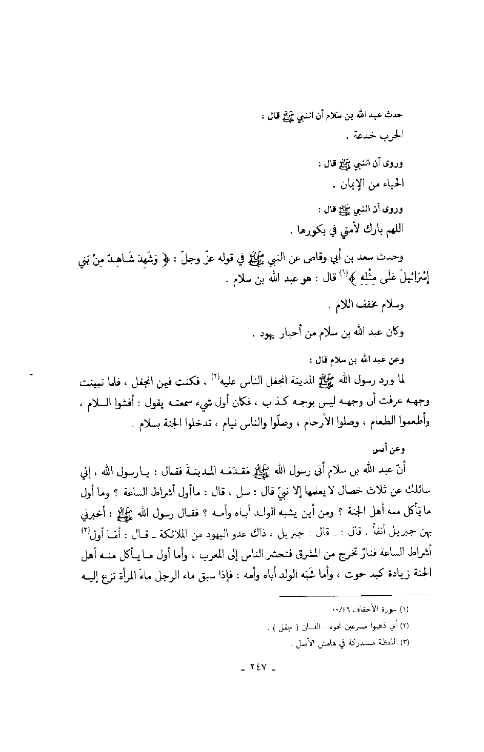وعن أنس: أن عبد الله بن سلام أتى رسول الله صَلَّى اللهُ عَلَيْهِ وَسَلَّمَ مقدمه المدينة فقال: يا رسول الله، إني سائلك عن ثلاث خصال لا يعلمها إلا نبي قال: سل، قال: ما أول أشراط الساعة؟ وما أول ما يأكل منه أهل الجنة؟ ومن أين يشبه الولد أباه وأمه؟ فقال رسول الله صَلَّى اللهُ عَلَيْهِ وَسَلَّمَ: أخبرني بهن جبريل آنفاً. قال: - قال: جبريل، ذاك عدو اليهود من الملائكة - قال: أما أول أشراط الساعة فنار تخرج من المشرق فتحشر الناس إلى المغرب، وأما أول ما يأكل منه أهل الجنة زيادة كبد حوت، وأما شبه الولد أباه وأمه: فإذا سبق ماء الرجل ماء المرأة نزع إليه