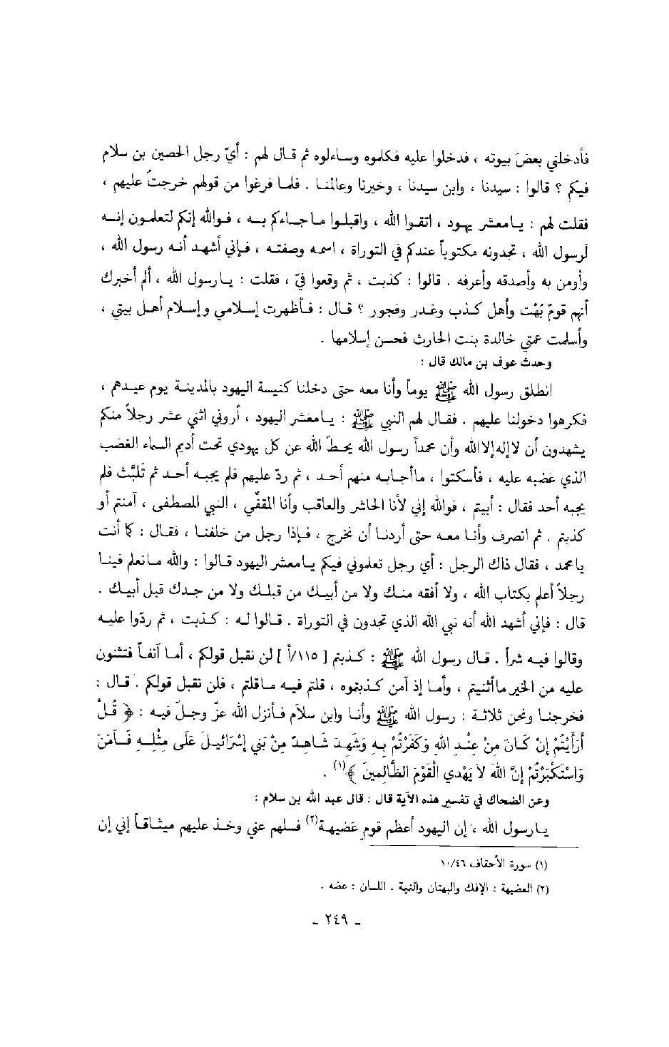 وحدث عوف بن مالك قال: انطلق رسول الله صَلَّى اللهُ عَلَيْهِ وَسَلَّمَ يوماً وأنا معه حتى دخلنا كنيسة بالمدينة يوم عيدهم، فكرهوا دخولنا عليهم. فقال لهم النبي صَلَّى اللهُ عَلَيْهِ وَسَلَّمَ: يا معشر اليهود، أروني اثني عشر رجلاً منكم يشهدون أن لا إله إلا الله وأن محمداً رسول الله يحط الله عن كل يهودي تحت أديم السماء الغضب الذي غضبه عليه، فاسكتوا، ما أجابه منهم أحد، ثم رد عليهم فلم يجبه أحد ثم تلبث فلم يجبه أحد فقال: أبيتم، فوالله إني لأنا الحاشر والعاقب وأنا المقفي، النبي المصطفى، لآمنتم أو كذبتم. ثم انصرف وأنا معه حتى أردنا أن نخرج، فإذا رجل من خلفنا، فقال: كما أنت يا محمد، فقال ذاك الرجل: أي رجل تعلموني فيكم يا معشر اليهود قالوا: والله ما نعلم فينا رجلاً أعلم بكتاب الله، ولا أفقه منك ولا من أبيك من قبلك ولا من جدك قبل أبيك. قال: فإني أشهد الله أنه نبي الله الذي تجدون في التوراة. قالوا له: كذبت، ثم ردوا عليه وقالوا فيه شراً. قال رسول الله صَلَّى اللهُ عَلَيْهِ وَسَلَّمَ: كذبتم لن نقبل قولكم، أما آنفاً فتثنون عليه من الخير ما أثنيتم، وأما إذ آمن كذبتموه، قلتم فيه ما قلتم، فلن نقبل قولكم. قال: فخرجنا ونحن ثلاثة: رسول الله صَلَّى اللهُ عَلَيْهِ وَسَلَّمَ وأنا وابن سلام فأنزل الله عز وجل فيه: " قل أرأيتم إن كان من عند الله وكفرتم به وشهد شاهد من بني إسرائيل على مثله فآمن واستكبرتم إن الله لا يهدي القوم الظالمين ".