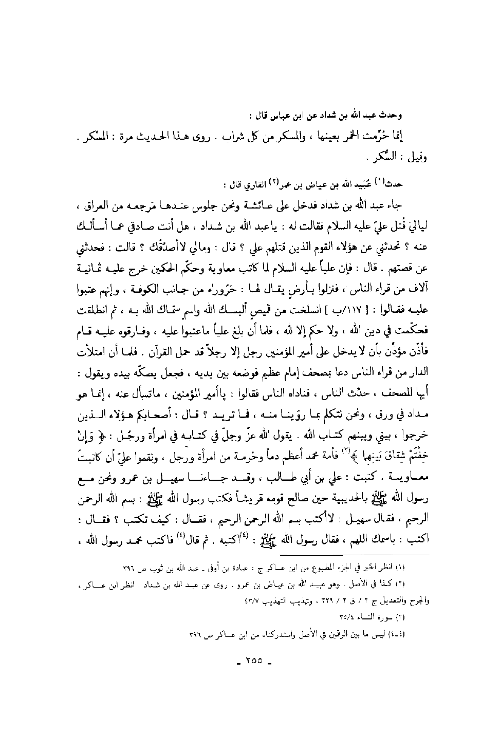 حدث عبيد الله بن عياض بن عمر القاري قال: جاء عبد الله بن شداد فدخل على عائشة ونحن جلوس عندها مرجعه من العراق، ليالي قتل علي عليه السلام فقالت له: يا عبد الله بن شداد، هل أنت صادقي عما أسألك عنه؟ تحدثني عن هؤلاء القوم الذين قتلهم علي؟ قال: ومالي لا أصدقك؟ قالت: فحدثني عن قصتهم. قال: فإن علياً عليه السلام لما كاتب معاوية وحكم الحكمين خرج عليه ثمانية آلاف من قراء الناس، فنزلوا بأرض يقال لها: حرواء من جانب الكوفة، وإنهم عتبوا عليه فقالوا: انسلخت من قميص ألبسك الله واسم سماك الله به، ثم انطلقت فحكمت في دين الله، ولا حكم إلا لله، فلما أن بلغ علياً ما عتبوا عليه، وفارقوه عليه قام فأذن مؤذن بأن لا يدخل على أمير المؤمنين رجل إلا رجلاً قد حمل القرآن. فلما أن امتلأت الدار من قراء الناس دعا بمصحف إمام عظيم فوضعه بين يديه، فجعل يصكه بيده ويقول: أيها المصحف، حدث الناس، فناداه الناس فقالوا: يا أمير المؤمنين، ما تسأل عنه، إنما هو مداد في ورق، ونحن نتكلم بما روينا منه، فما تريد؟ قال: أصحابكم هؤلاء الذين خرجوا، بيني وبينهم كتاب الله. يقول الله عز وجل في كتابه في امرأة ورجل: " وإن خفتم شقاق بينهما " فأمة محمد أعظم دماً وحرمة من امرأة ورجل، ونقموا علي أن كاتبت معاوية. كتبت: علي بن أبي طالب، وقد جاءنا سهيل بن عمرو ونحن مع رسول الله صَلَّى اللهُ عَلَيْهِ وَسَلَّمَ بالحديبية حين صالح قومه قريشاً فكتب رسول الله صَلَّى اللهُ عَلَيْهِ وَسَلَّمَ: بسم الله الرحمن الرحيم، فقال سهيل: لا أكتب بسم الله الرحمن الرحيم، فقال: كيف تكتب؟ فقال: اكتب: باسمك اللهم، فقال رسول الله صَلَّى اللهُ عَلَيْهِ وَسَلَّمَ: اكتبه. ثم قال فاكتب محمد رسول الله،