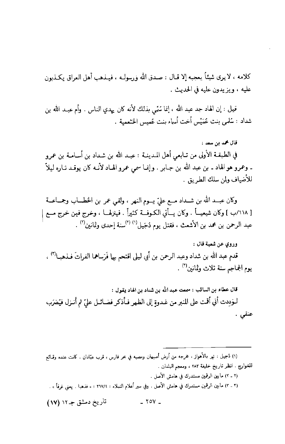 وروي عن شعبة قال: قدم عبد الله بن شداد وعبد الرحمن بن أبي ليلى اقتحم بهما فرساهما الفرات فذهبا، يوم الجماجم سنة ثلاث وثمانين.