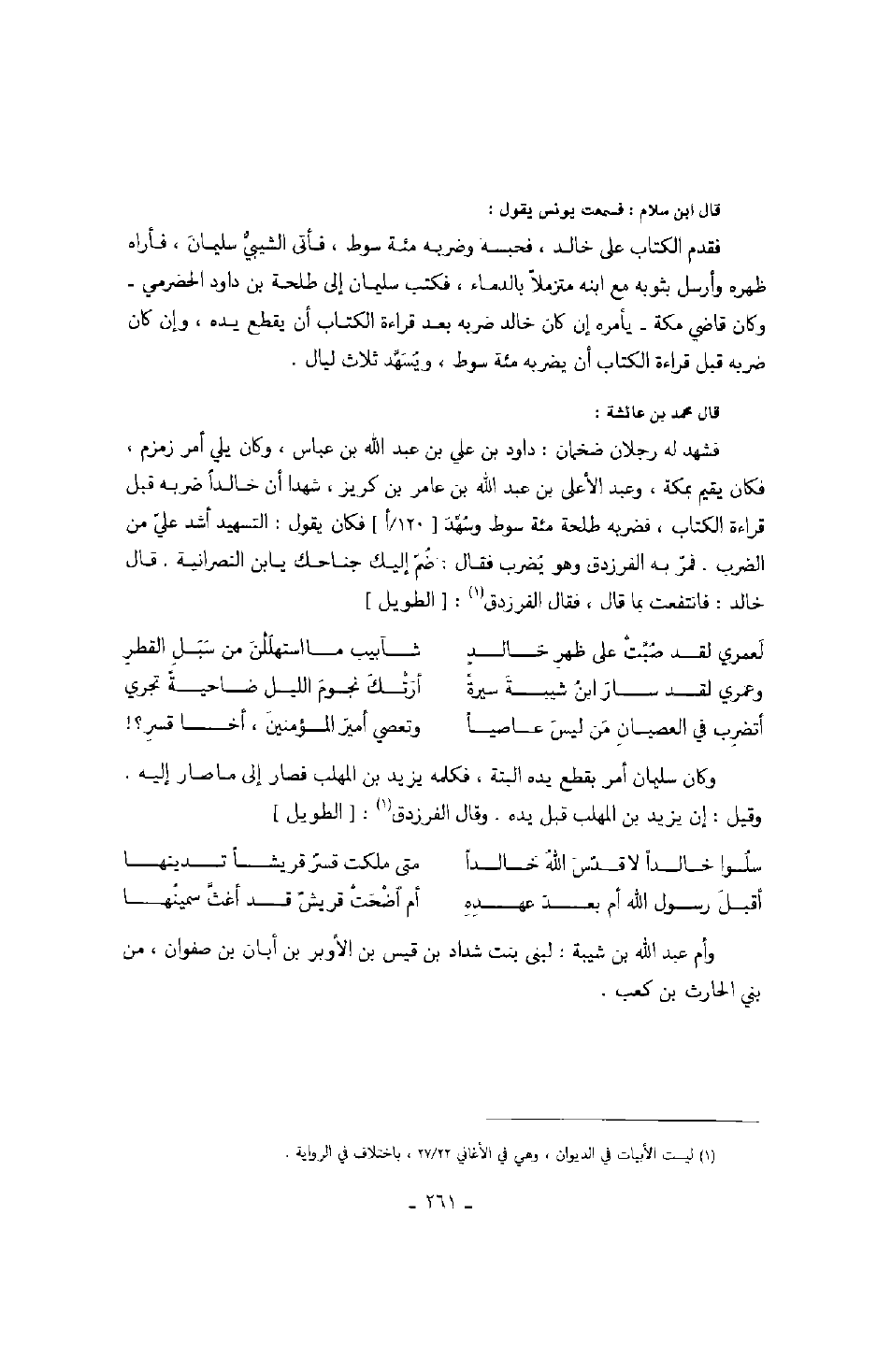 قال ابن سلام: فسمعت يونس يقول: فقدم الكتاب على خالد، فحبسه وضربه مئة سوط، فأتى الشيبي سليمان، فأراه ظهره وأرسل بثوبه مع ابنه متزملاً بالدماء، فكتب سليمان إلى طلحة بن داود الحضرمي - وكان قاضي مكة - يأمره إن كان خالد ضربه بعد قراءة الكتاب أن يقطع يده، وإن كان ضربه قبل قراءة الكتاب أن يضربه مئة سوط، ويسهد ثلاث ليال.