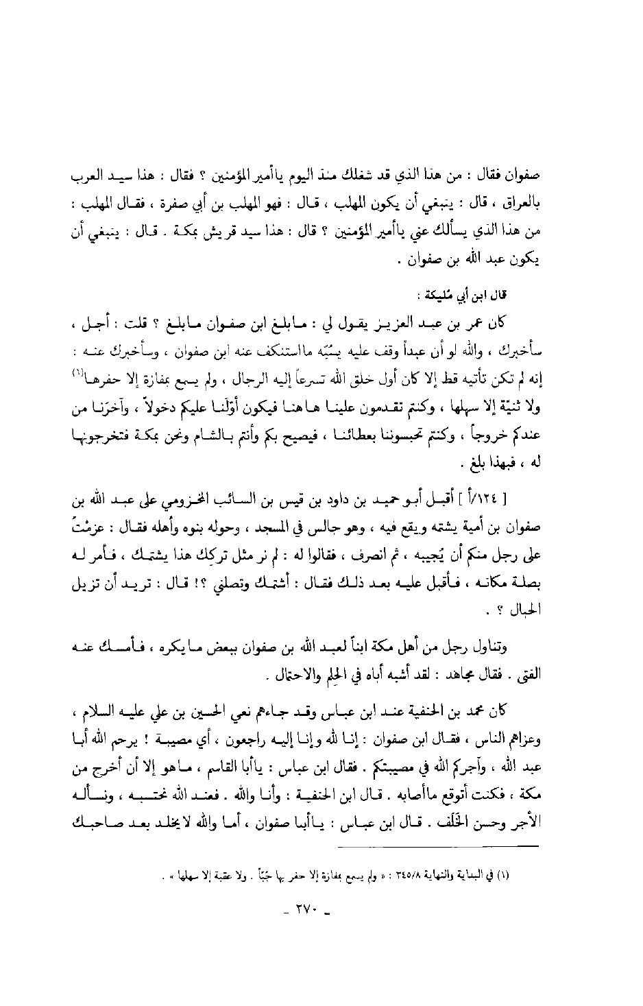 صفوان فقال: من هذا الذي قد شغلك منذ اليوم يا أمير المؤمنين؟ فقال: هذا سيد العرب بالعراق، قال: ينبغي أن يكون المهلب، قال: فهو المهلب بن أبي صفرة، فقال المهلب: من هذا الذي يسألك عني يا أمير المؤمنين؟ قال: هذا سيد قريش بمكة. قال: ينبغي أن يكون عبد الله بن صفوان.