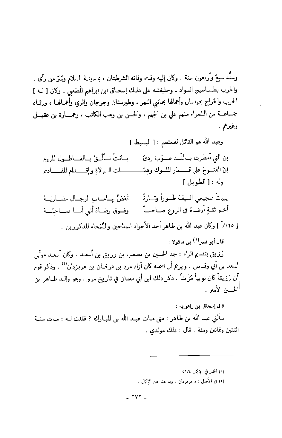 قال إسحاق بن راهويه: سألني عبد الله بن طاهر: متى مات عبد الله بن المبارك؟ فقلن له: مات سنة اثنتين وثمانين ومئة. قال: ذلك مولدي.