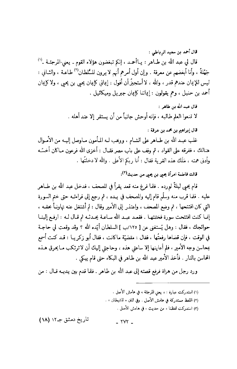 قال أحمد بن سعيد الرباطي: قال لي عبد الله بن طاهر: يا أحمد، إنكم تبغضون هؤلاء القوم يعني المرجئة جهلة، وأنا أبغضهم عن معرفة. وإن أول أمرهم أنهم لا يرون للسلطان طاعة، والثاني: ليس للإيمان عندهم قدر، والله، لا أستجير أن أقول: إيماني كإيمان يحيى بن يحيى، ولا كإيمان أحمد بن حنبل، وهم يقولون: إيماننا كإيمان جبريل وميكائيل.