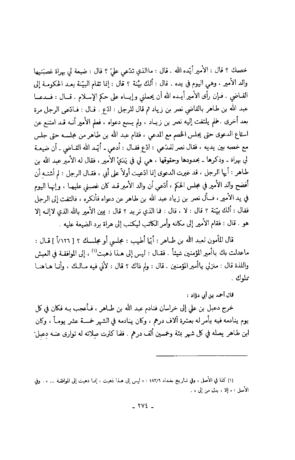 خصمك؟ قال: الأمير أيده الله. قال: ما الذي تدعي علي؟ قال: ضيعة لي بهراة غصبنيها والد الأمير، وهي اليوم في يده. قال. قال: ألك بينة؟ قال: إنما تقام البينة بعد الحكومة إلى القاضي. فإن رأى الأمير أيده الله أن يحملني وإياه على حكم الإسلام. قال: فدعا عبد الله بن طاهر بالقاضي نصر بن زياد ثم قال للرجل: ادع. قال: فادعى الرجل مرة بعد أخرى. فلم يلتفت إليه نصر بن زياد، ولم يسمع دعواه، فعلم الأمير أنه قد امتنع عن استماع الدعوى حتى يجلس الخصم مع المدعي، فقال عبد الله بن طاهر من مجلسه حتى جلس مع خصمه بين يديه، فقال نصر للمدعي: ادع فقال: أدعي أيد الله القاضي أن ضيعة لي بهراة وذكرها بحدودها وحقوقها، هي لي في يدي الأمير، فقال له الأمير عبد الله بن طاهر: أيها الرجل، قد غيرت الدعوى إنما ادعيت أولاً على أبي، فقال الرجل: لم أشته أن أفضح والد الأمير في مجلس الحكم، ادعي أن والد الأمير قد كان غصبني عليها، وإنها اليوم في يد الأمير، فسأل نصر بن زياد عبد الله بن طاهر عن دعواه فأنكره، فالتفت إلى الرجل فقال: ألك بينة؟ قال: لا، قال: فما الذي تريده؟ قال: يمين الأمير بالله الذي لا إله إلا هو قال: فقال الأمير إلى مكانه وأمر الكاتب ليكتب إلى هراة برد الضيعة عليه.