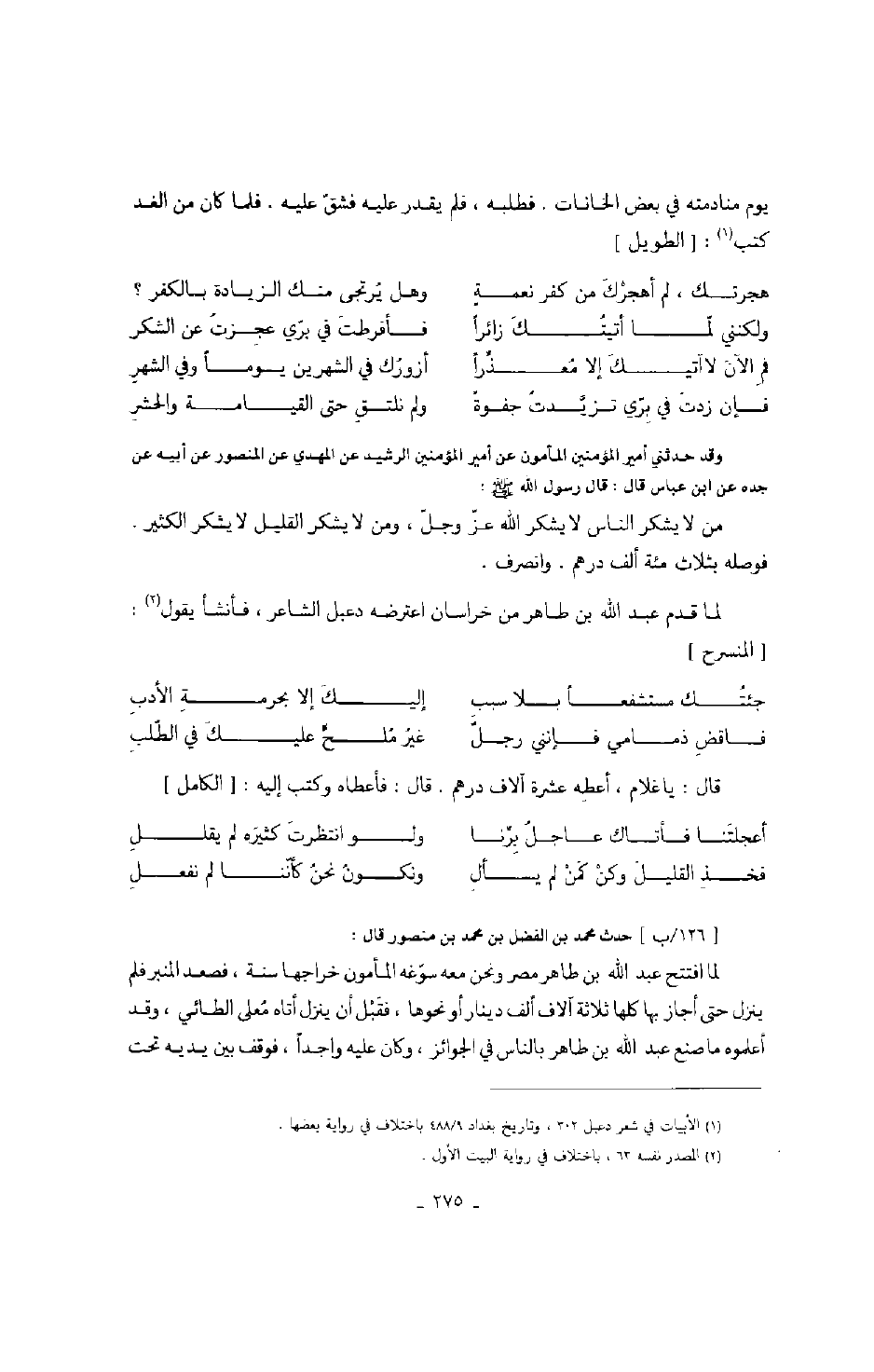 وقد حدثني أمير المؤمنين المأمون عن أمير المؤمنين الرشيد عن المهدي عن المنصور عن أبيه عن جده عن ابن عباس قال: قال رسول الله صَلَّى اللهُ عَلَيْهِ وَسَلَّمَ: " من لا يشكر الله عز وجل، ومن لا يشكر القليل لا يشكر الكثير. " فوصله بثلاث مئة ألف درهم. وانصرف.