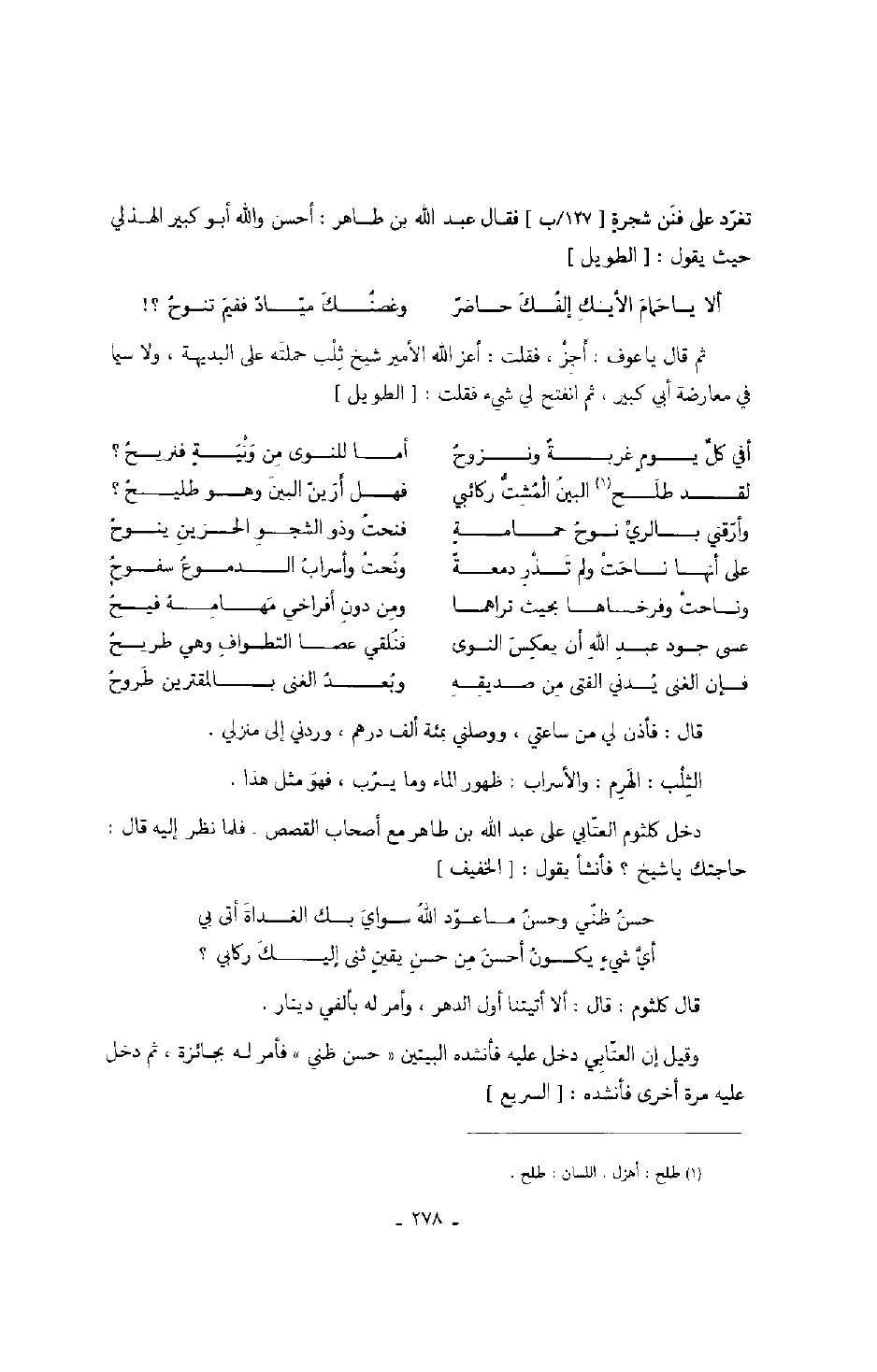 تغرد على فنن شجرة فقال عبد الله بن طاهر: أحسن والله أبو كبير الهذلي جيث يقول: الطويل: