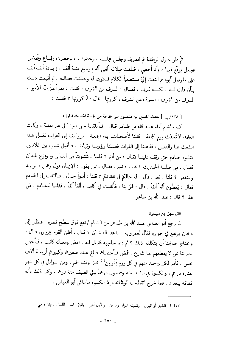 حدث الحسين بن منصور عن جماعة من طلبة الحديث قالوا: كنا بالشام أيام عبد الله بن طاهر قال: فأملقنا حتى صرنا في غير نفقة، وكانت العلماء لا تحدث يوم الجمعة، فقلنا لأصحابنا يوم الجمعة: مروا بنا إلى الفرات نغسل هذا الشعث عنا والدنس، فذهبنا إلى الفرات فغسلنا رؤوسنا وثيابنا، فأقبل شاب بين غلالتين يتلوه خادم حتى وقف علينا فقال: من انتم؟ قلنا: شتوت من الناس ونوازع بلدان فقال: من طلبة الحديث؟ قلنا: نعم. فقال: ممن يقول: الإيمان قول وعمل، يزيد وينقص؟ قلنا: نعم. قال: فما حالكم في نفقاتكم؟ قلنا: أسوأ حال. فالتفت إلى الخادم فقال: يعطون ألفاً ألفاً. قال: فمر بنا، فألقيت في أكمامنا، ألفاً ألفاً، فقلنا للخادم: من هذا؟ قال: عبد الله بن طاهر.