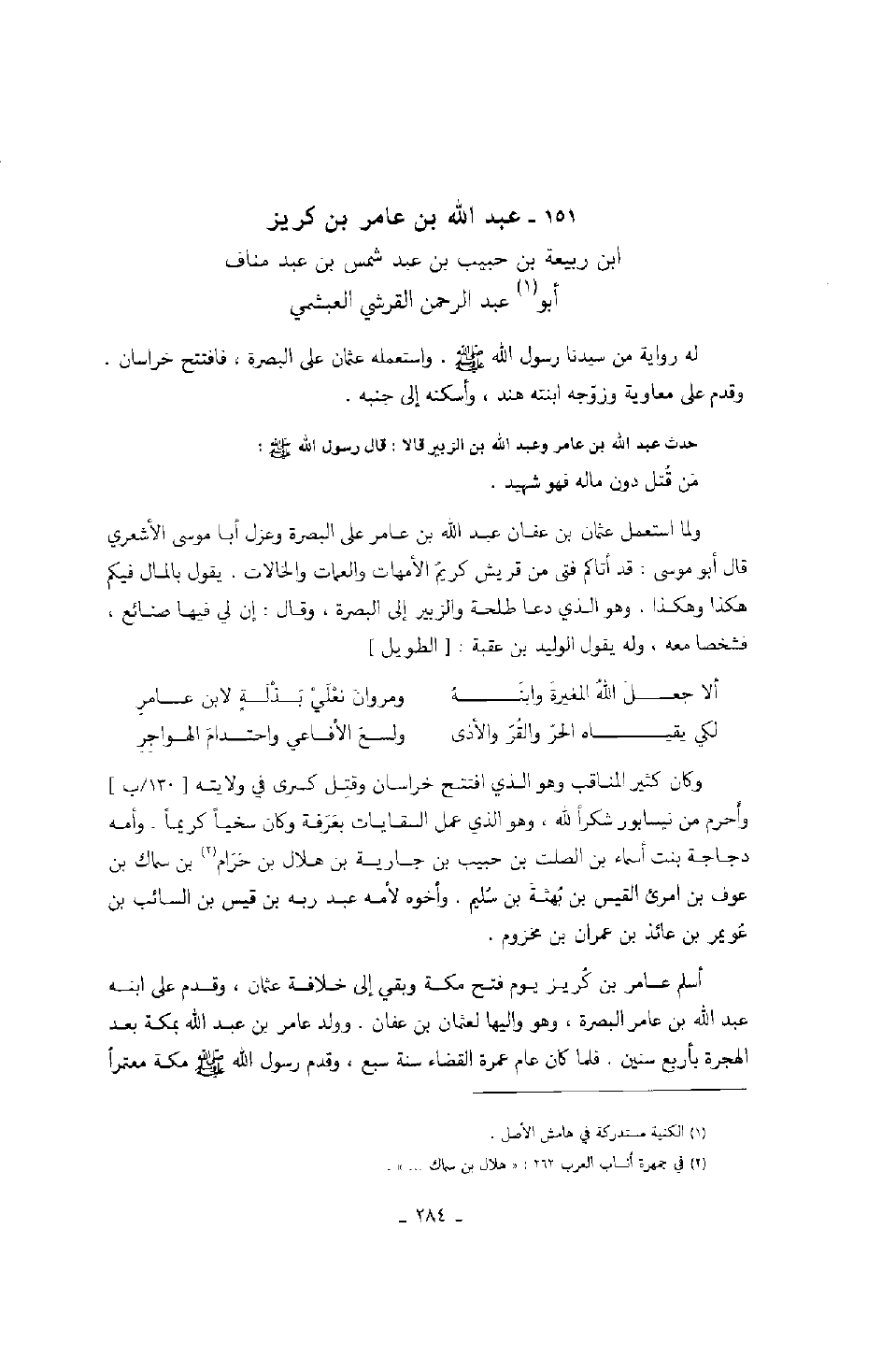 ولما استعمل عثمان بن عفان عبد الله بن عامر على البصرة وعزل أبا موسى الأشعري قال أبو موسى: قد أتاكم فتى من قريش كريم الأمهات والعمات والخالات. يقول بالمال فيكم هكذا هكذا. وهو الذي دعا طلحة والزبير إلى البصرة، وقال: إن لي فيها صنائع، فشخصا معه، وله يقول الوليد بن عقبة: الطويل