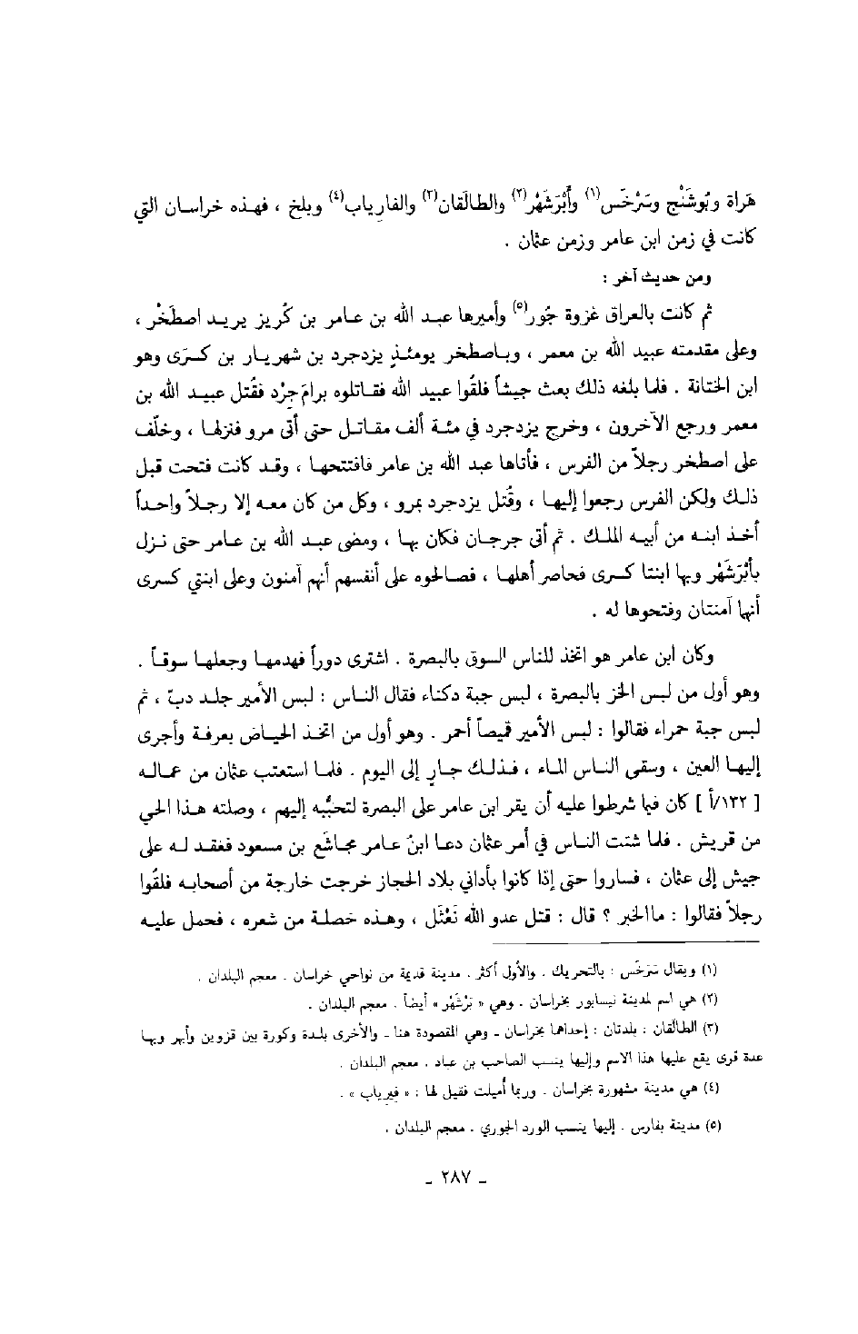 هراة وبوشنج وسرخس وأبر شهر والطالقان الفارياب وبلخ، فهذه خراسان التي كانت في زمن ابن عامر وزمن عثمان.