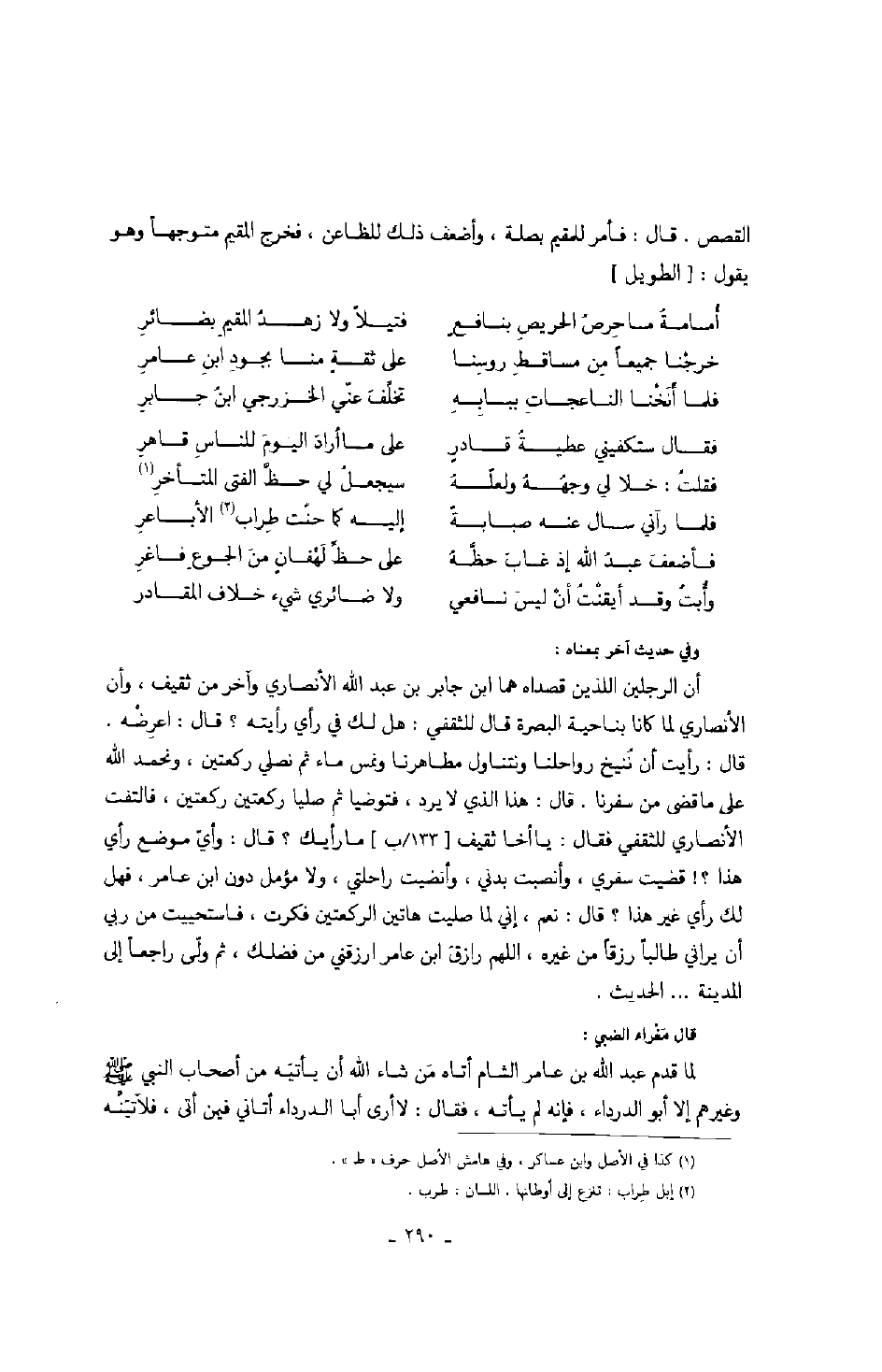 القصص. قال: فأمر للمقيم بصلة، وأضعف ذلك للظاعن، فخرج المقيم متوجهاً وهو يقول: الطويل: